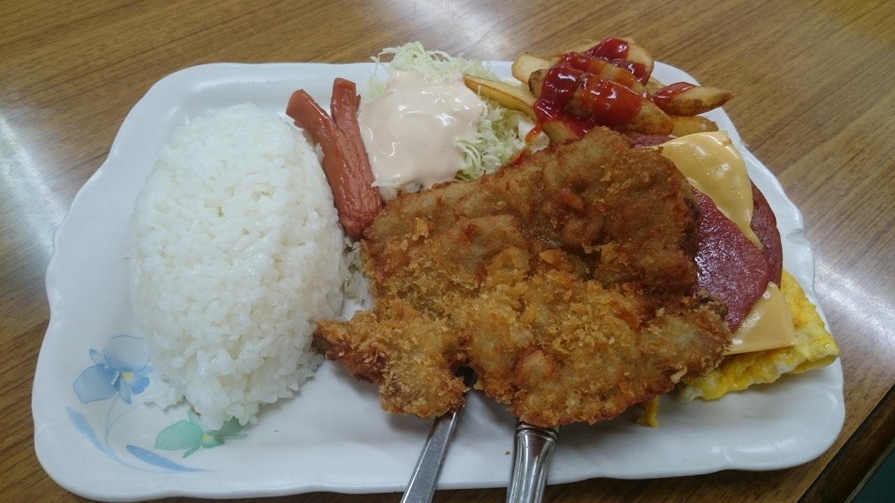 沖縄大学の前にある地元向けのお店ですが、いろいろな媒体で紹介されているので観光客のリピーターも多いようです。沖縄の定食屋さんの代表格のようなお店で、沖縄のコンビニではこのお店の名前の入ったアイスティが売られています。メニューは揚げ物中心の定食から沖縄そば、みそ汁(沖縄の具だくさんのもの)、ソーキ汁などもありますが、一番人気は、24時間食べられるランチ。Aランチ(880円)、Bランチ(780円)、Cランチ(680円)とあり、価格が安くなるにつれておかずの数がへりますが、必ずトンカツ、ポーク玉子、マカロニサラダ、キャベツの千切りが入っています。また、スープが必ず最初に出てきます。かなりのボリュームですが、沖縄に来たんだなぁ、とついついカロリーを気にせず食べてしまいます。
