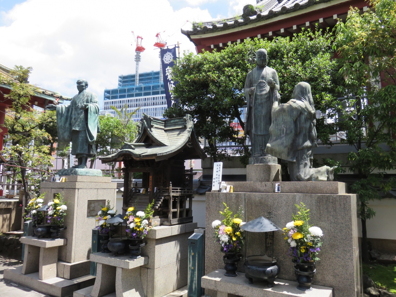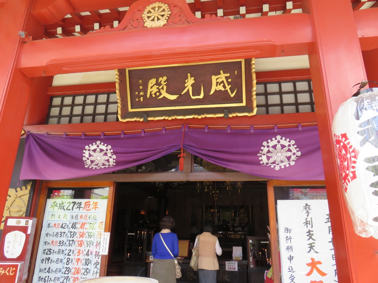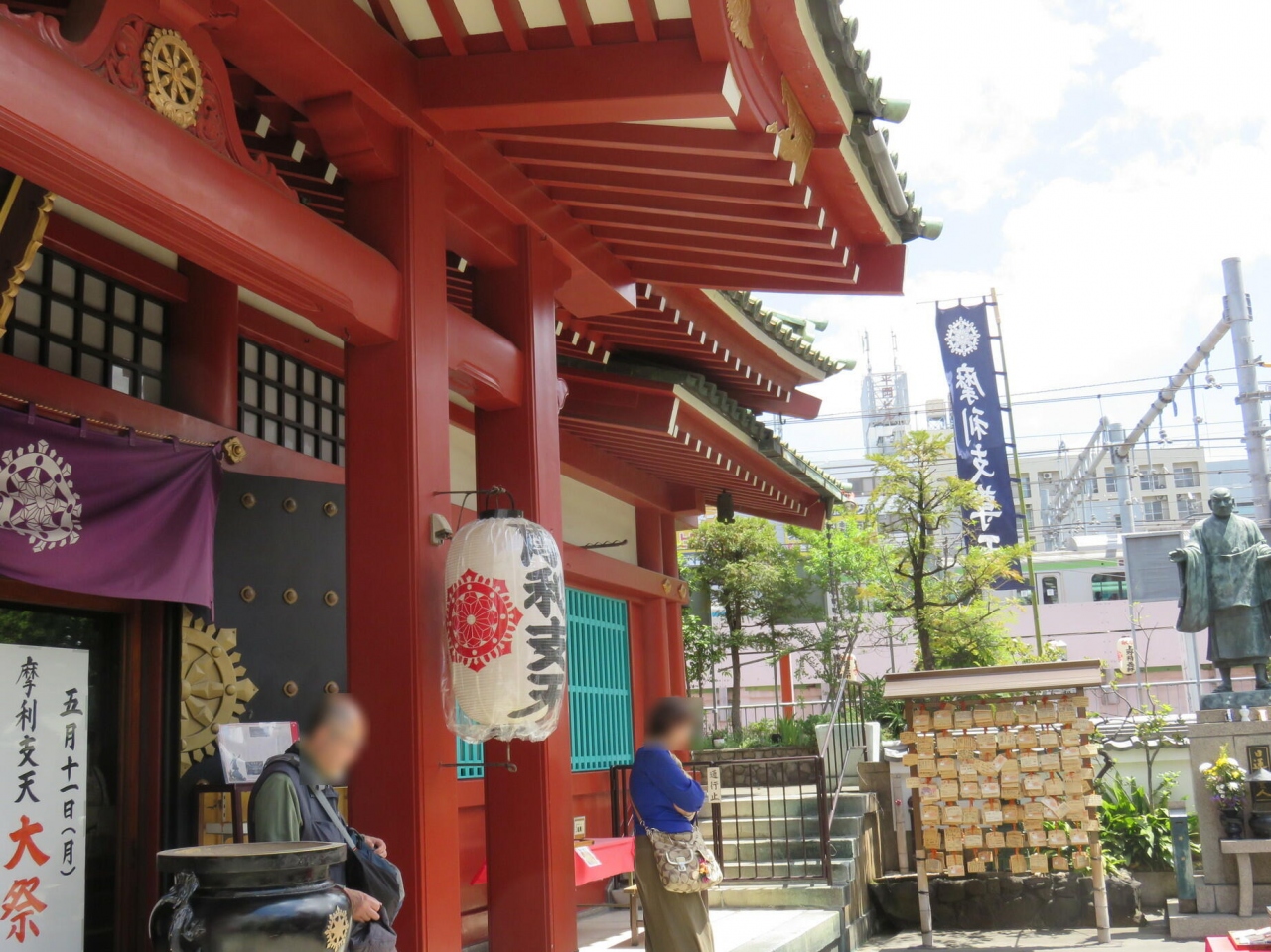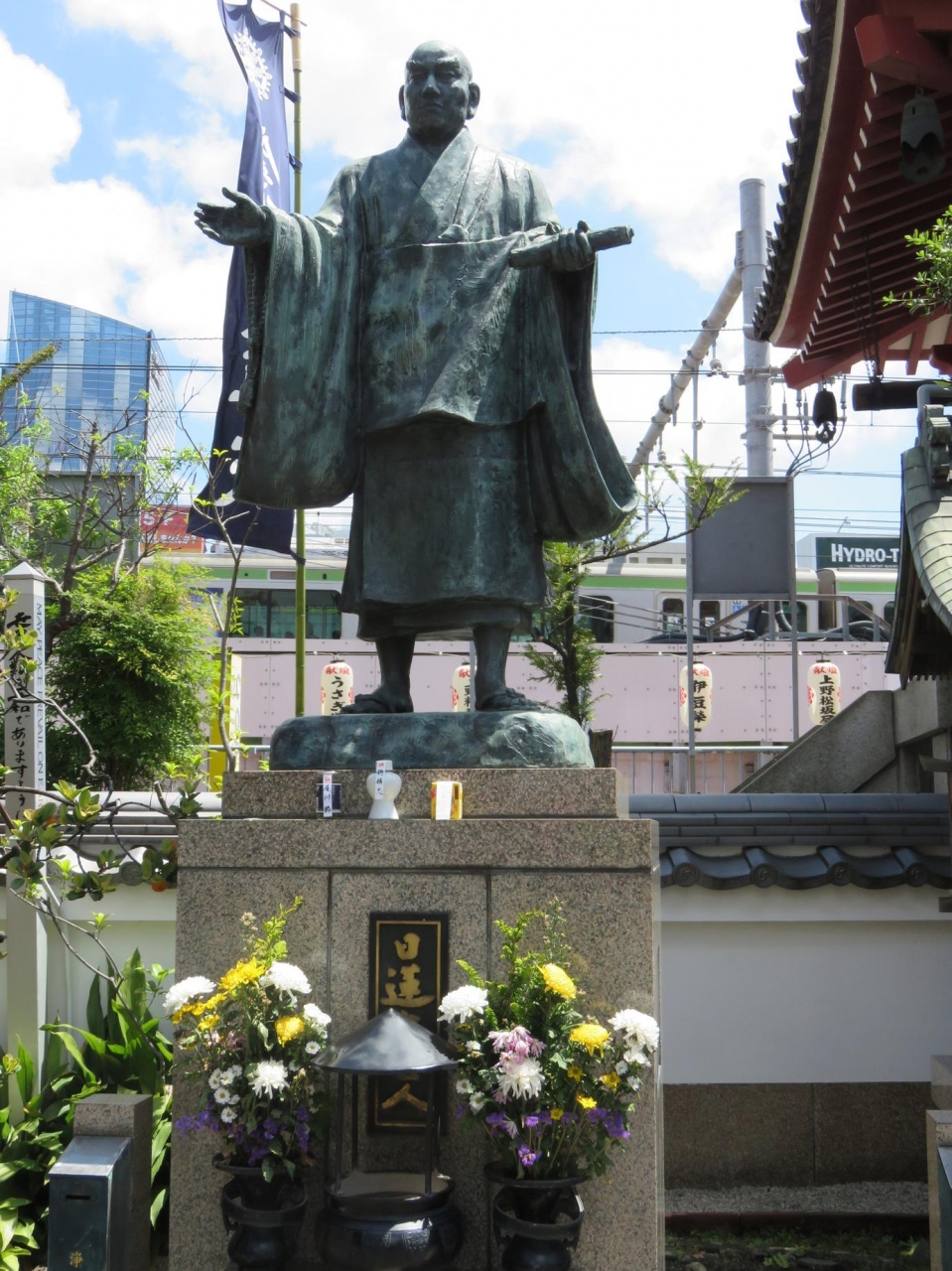 アメ横の二木の菓子へ行く途中に御邪魔しました。境内は階段を上がった二階部分になります。中央に階段があり、左右に小さな敷地があるだけで、後は本殿になっております。右側に日蓮上人像が配置されていますが山手線の内回りがその後ろを通過していきます。都会ならではの組み合わせかと思います。