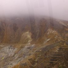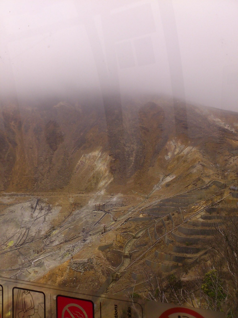 ロープウェイの大涌谷を降りると、そこは別世界です。あちこりから、白い噴煙がもくもくと上がっています。下の方は快晴だったのですが、大涌谷では霧が掛かり強風でした。山の天気はわかりません。くろたまご館を冷やかしで見回った後、噴煙地へ向かう途中、駐車場に並ぶ長いクルマの列を見ました。大涌谷へクルマで来ると大変なことになります。