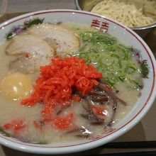 外が寒かっただけに、とんこつラーメンの旨味が腹に満たされ、思わず麺も追加でオーダーしてしまった。一応パックの紅しょうがはあるけど、がっつり入れたかったな?