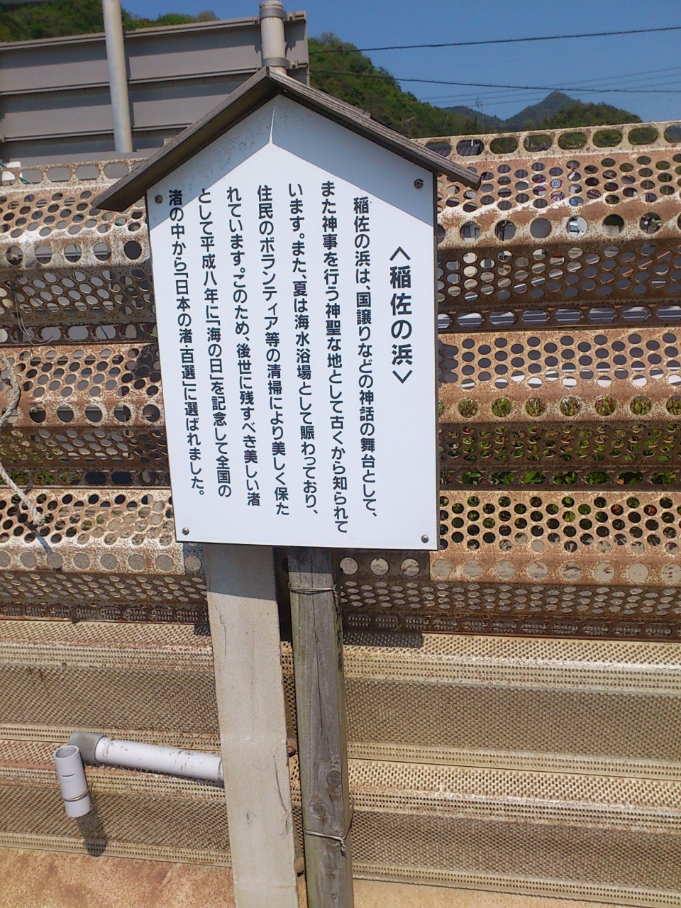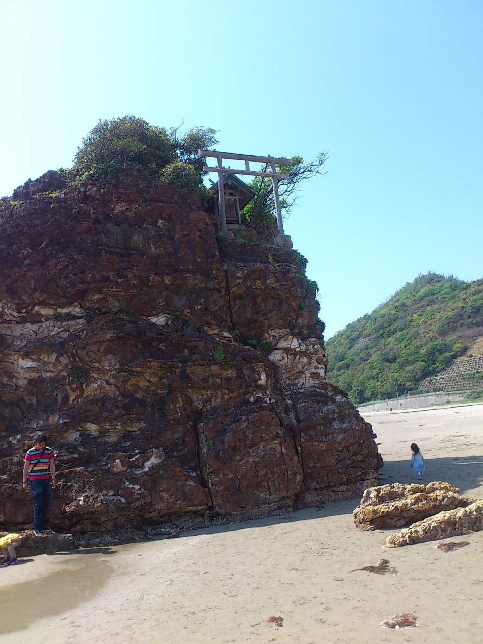 出雲大社から西へ阿国の道をまっすぐ進んで行くと海岸に出ます。かなり歩きではあります。バスで行くのが楽だと思いますが、1時間に1本しかありません。目の前に弁天島と呼ばれる岩があります。島と言っても砂浜に立っている岩で、上の方に小さな鳥居があります。神様たちはこの海岸に上陸し、出雲大社へ向かうのだそうです。
