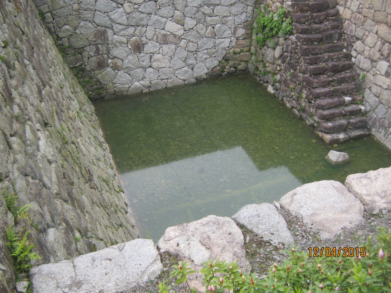 松山城本丸から南に下って来ると中腹に二の丸跡があります。そこには御殿がたてられていました。今は門と御殿の間取りの遺構の基礎石が当時の様子を伝えています。特に大井戸の遺構は当時の姿を見ることができます。庭園の様子も再現されています。
