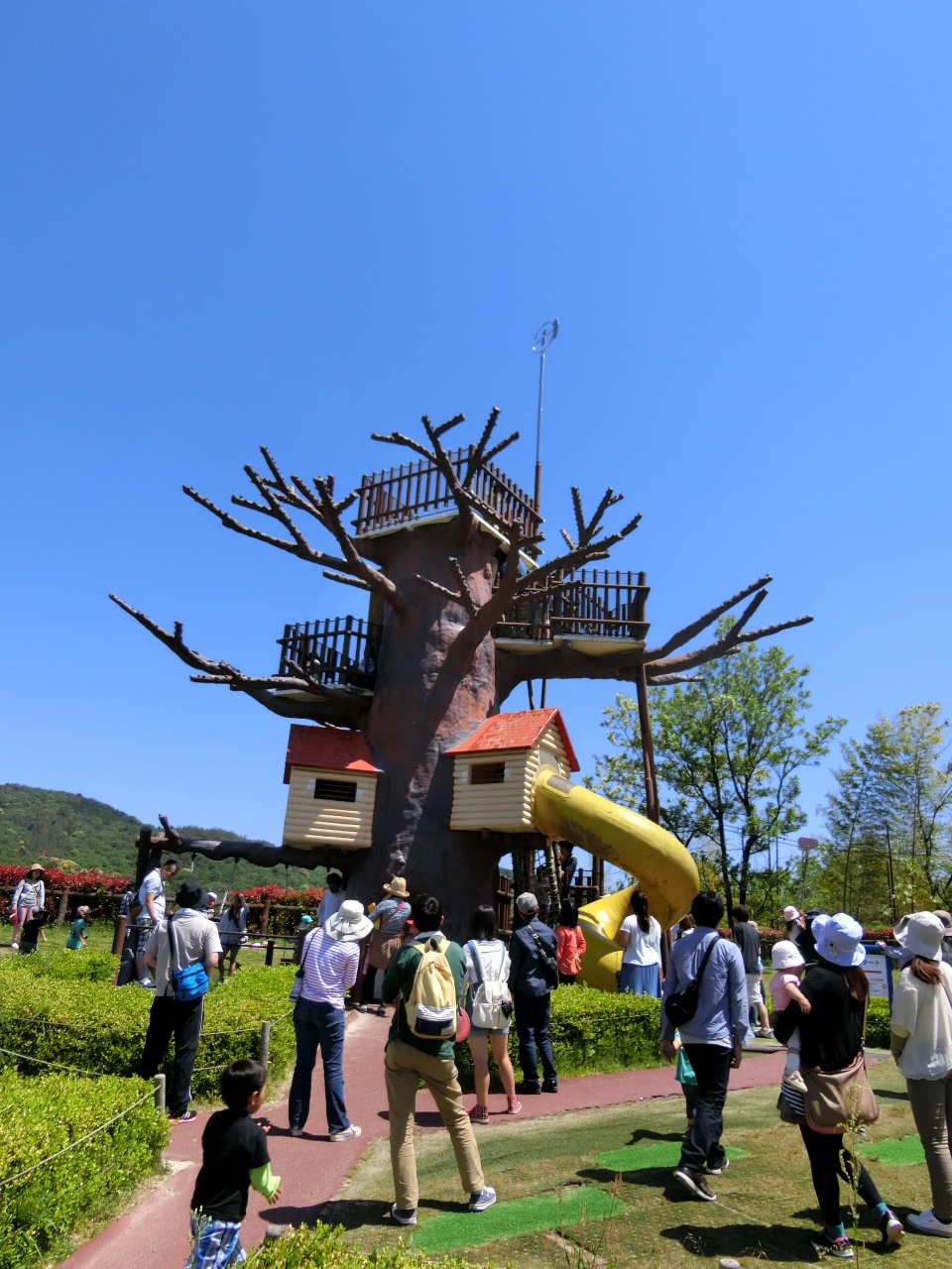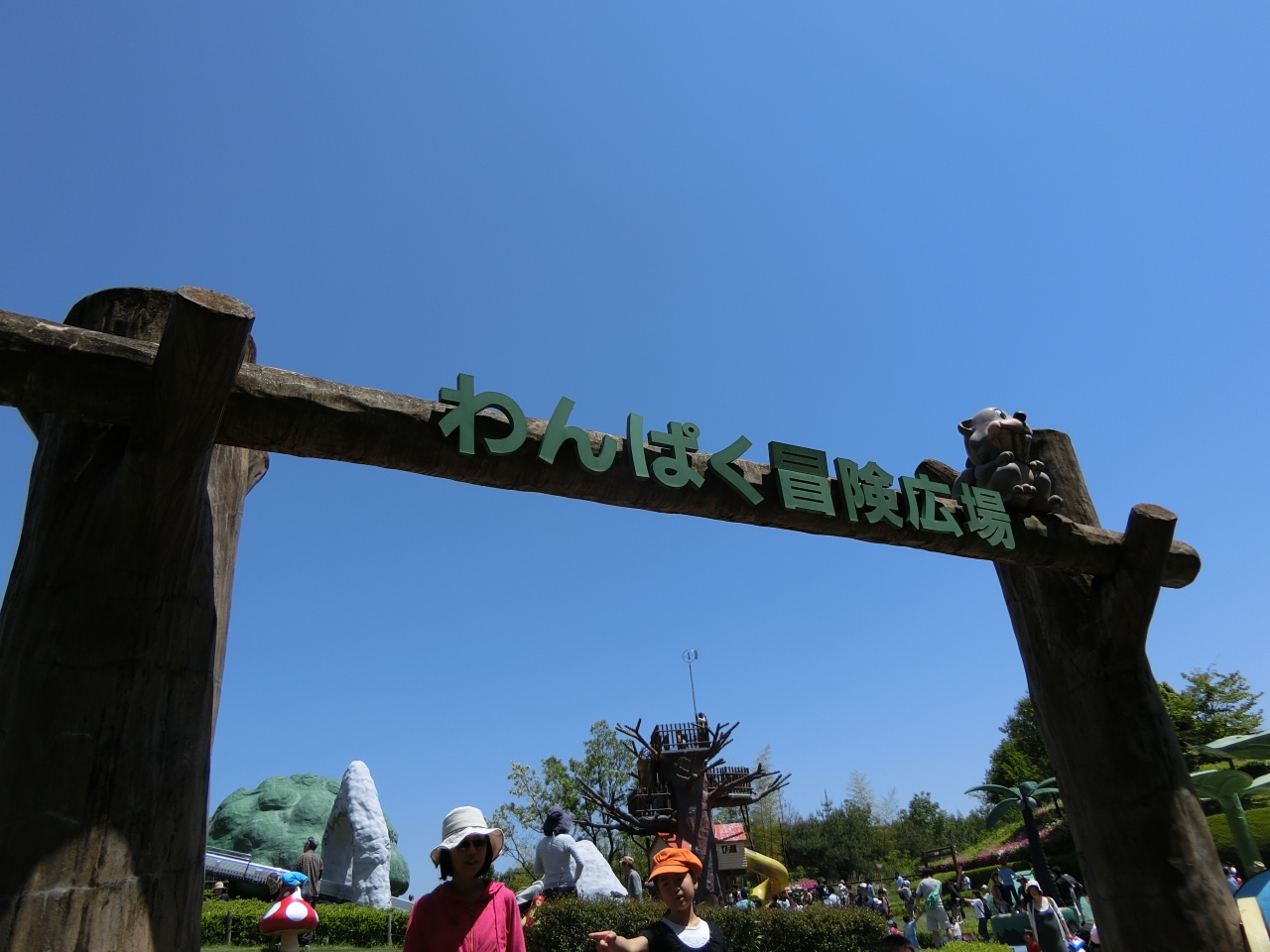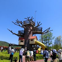 わくわく冒険広場と名付けられたエリアは、砂場やローラー式すべり台、木の格好の展望台風の遊具など充実しています。