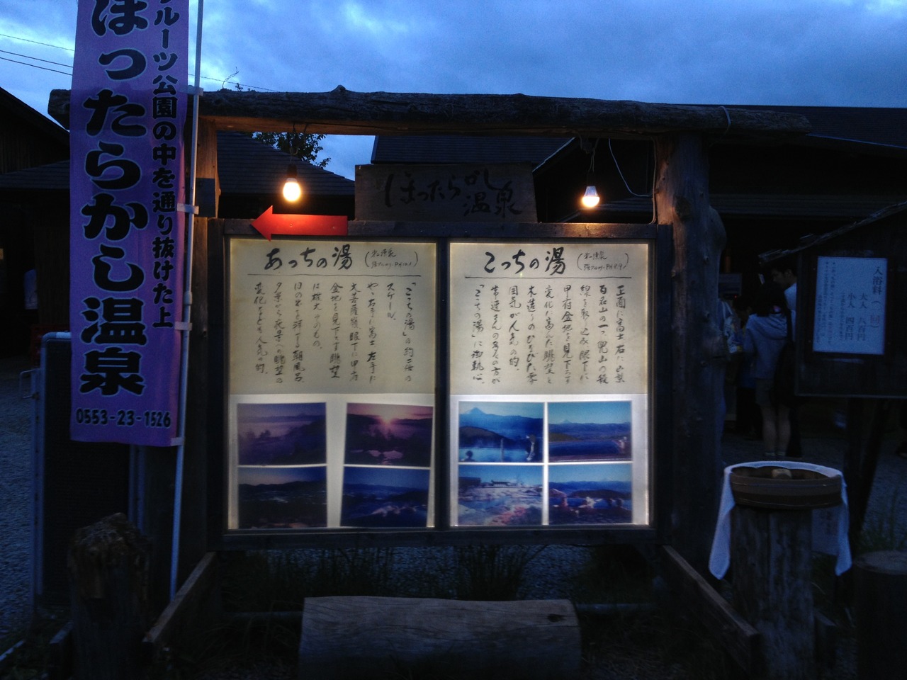 山の上にあるほったらかし温泉からは、甲府盆地が見下ろせ、夜景も満喫できるイチオシスポットです。あっちの湯、こっちの湯と2通りあり、どちらかを選ぶことになります。今回は甲府盆地の夜景を見るために、あっちの湯に行きました。なお、こっちの湯は富士山が綺麗に見えるとか。
