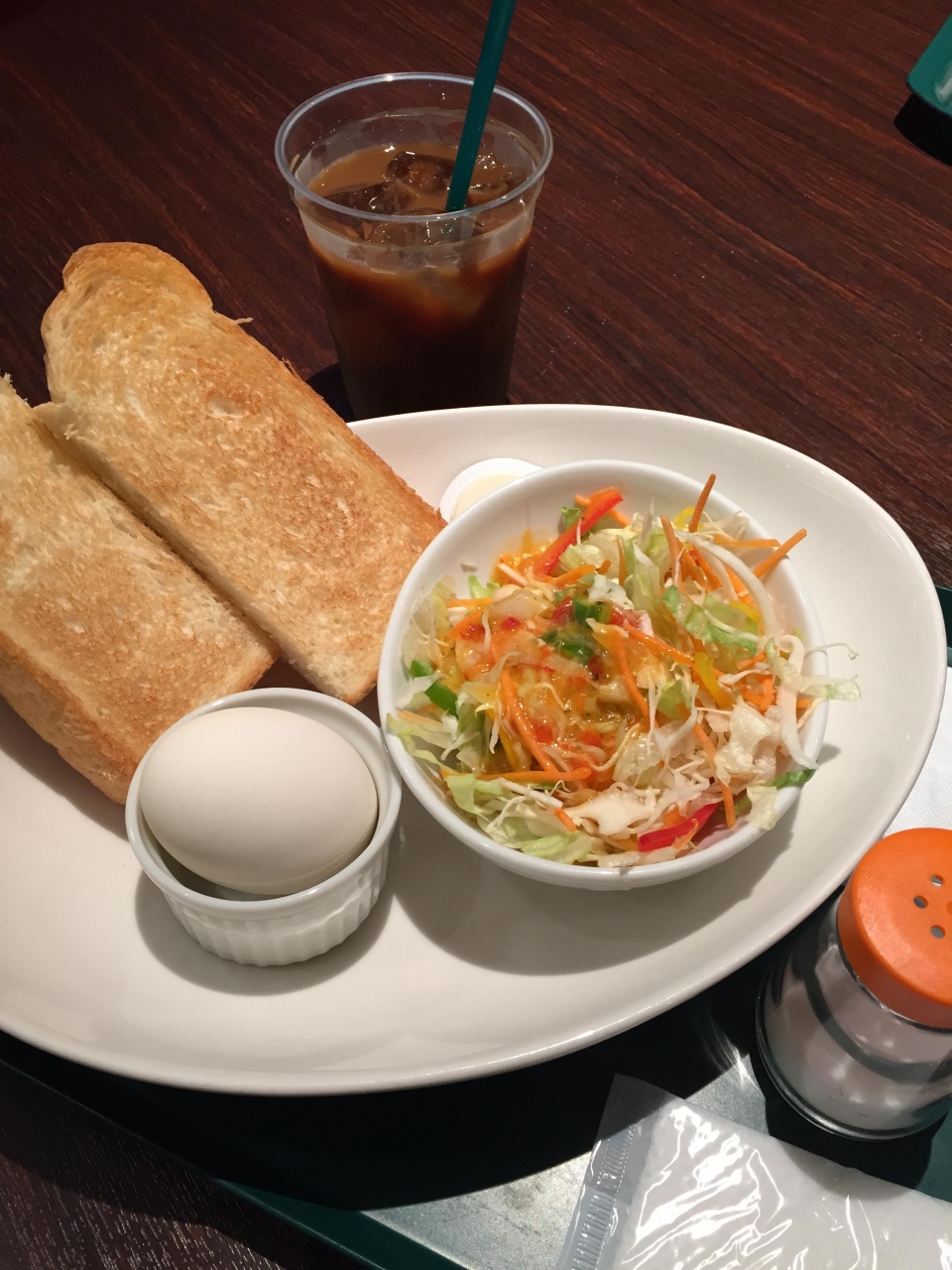 朝9時の羽田空港国際線ターミナル。朝食をどこでとろうかなと。軽めのもので良いのでコーヒーショップで。と思いついたのがプロントです。行ってみると案の定空いていました。場所が5階なので出発階や江戸小町と比べて人の往来が少なめです。予想通りでした。それにここの朝食、特にトーストセットはかなりのお得感です。パン、サラダ、ゆで卵とそれにドリンクがついて390円。メニュー構成も充実だし、金額も良心的。おまけに空いているときている。ここを選ばずしてどこにする、といった感じです。
