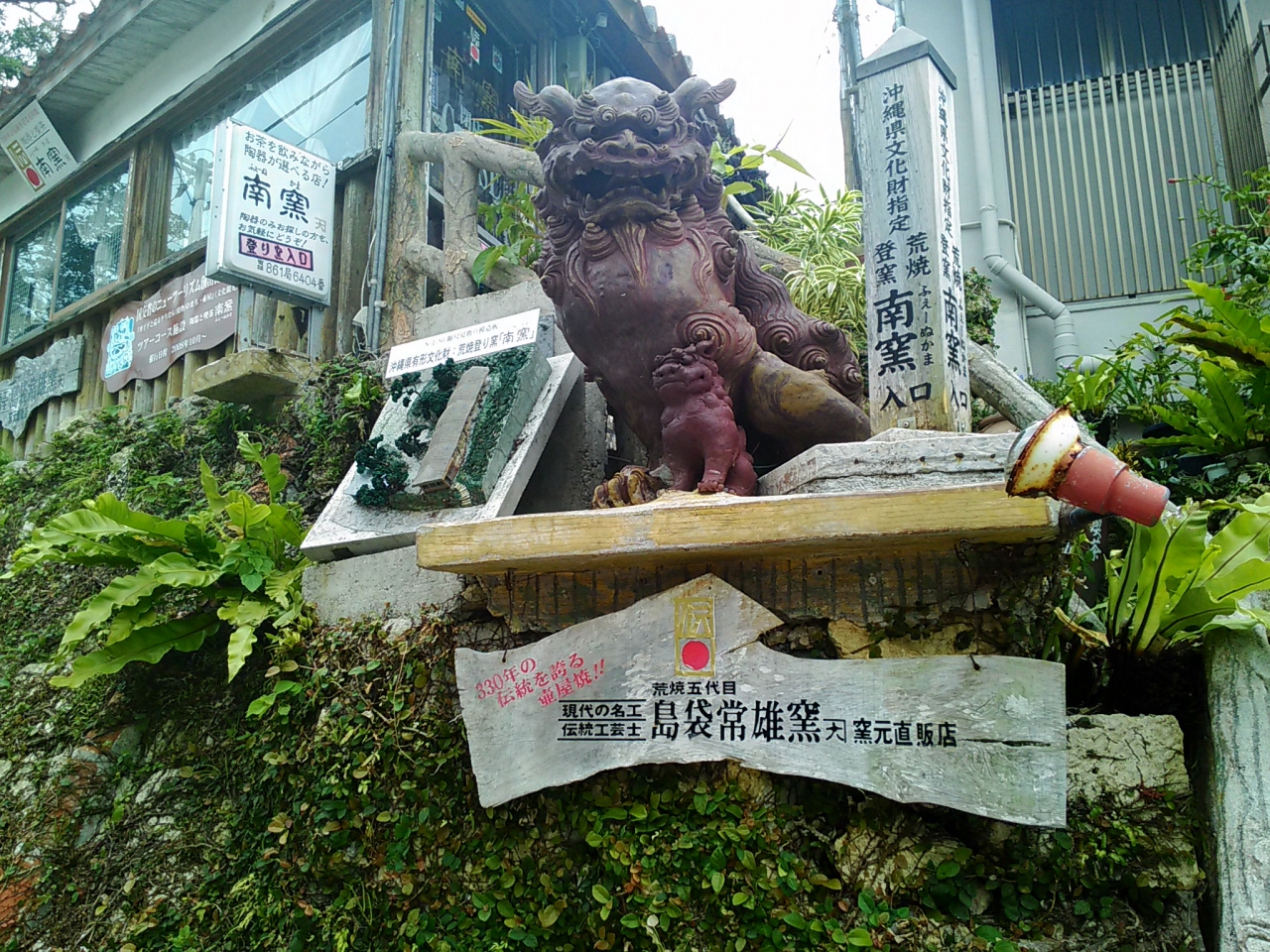 壺屋のやちむん通りにある南窯というやちむんを焼く登り窯と併設する形でカフェがあります。入り口から階段を上がってカフェに入り、カフェを通りすぎると、南窯という大きい登り窯があります。登り窯だけを見学したい人もどうぞと書いてあります。カフェでは実際に壺屋焼の器でコーヒーなどを楽しめたり、販売もしているそうです。