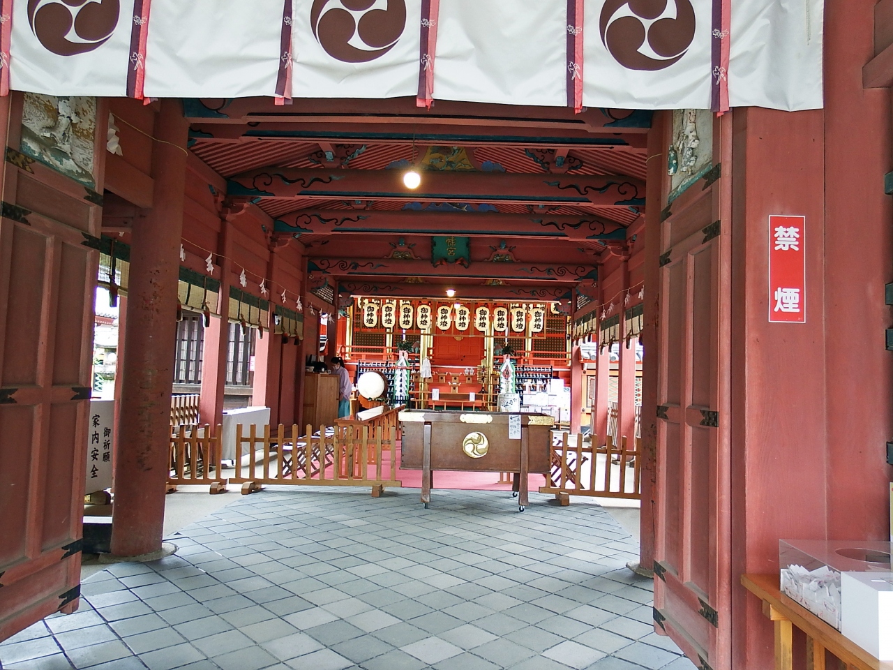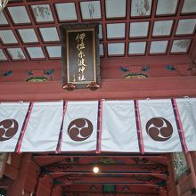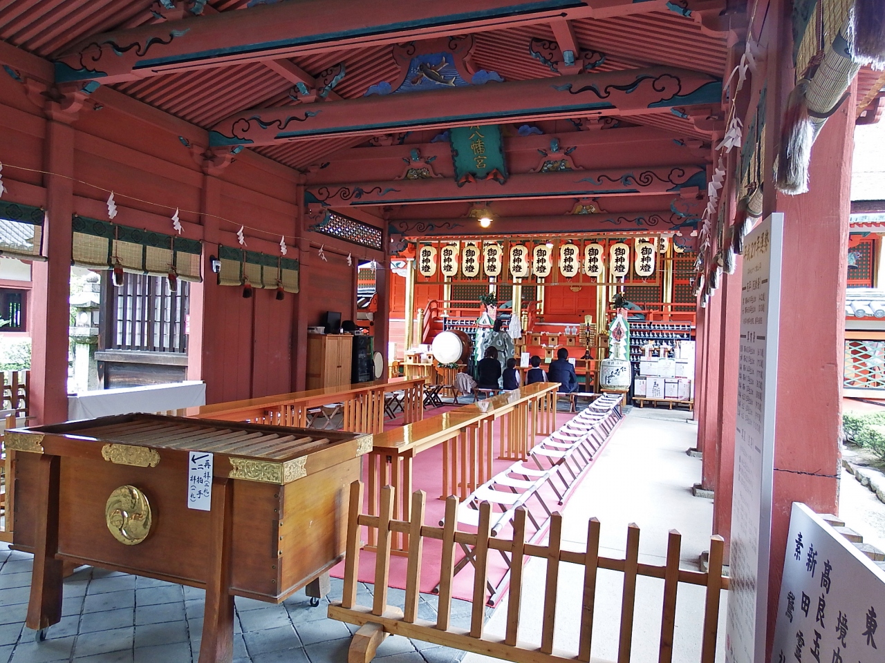 国の重要文化財に指定されている社殿は、全国に3例しかない八幡造という。八幡造りは切り妻造り・平入りの建物が前後に二棟並ぶ形で、後ろの建物を内殿、前野建物を外殿と呼ぶという。