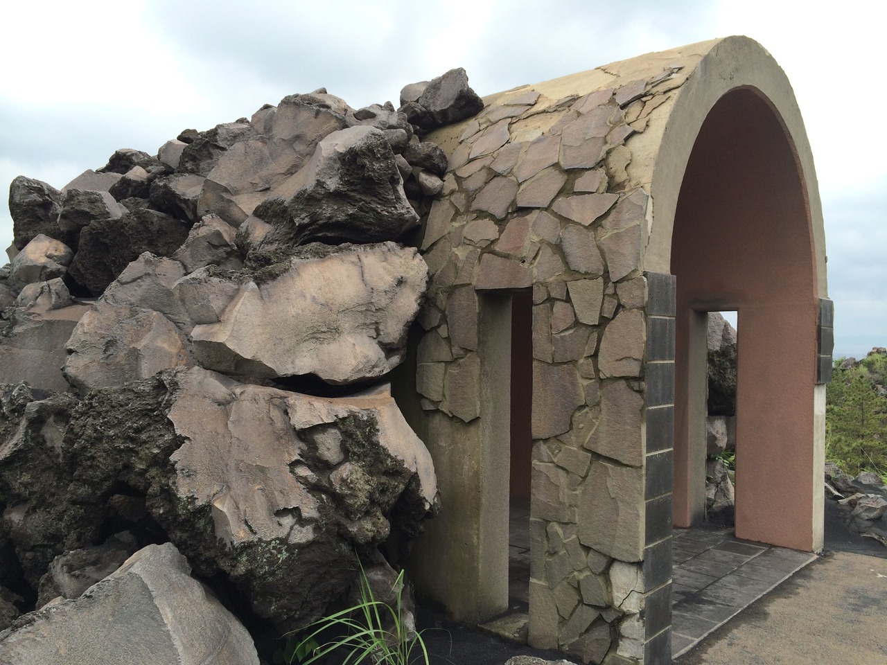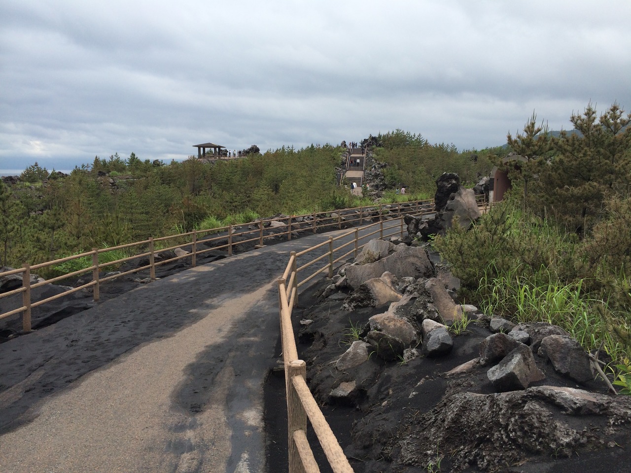 噴石に備えたトンネルが遊歩道に2か所ほどあって、その上には、(わざとらしく)噴石が乗っかってました。