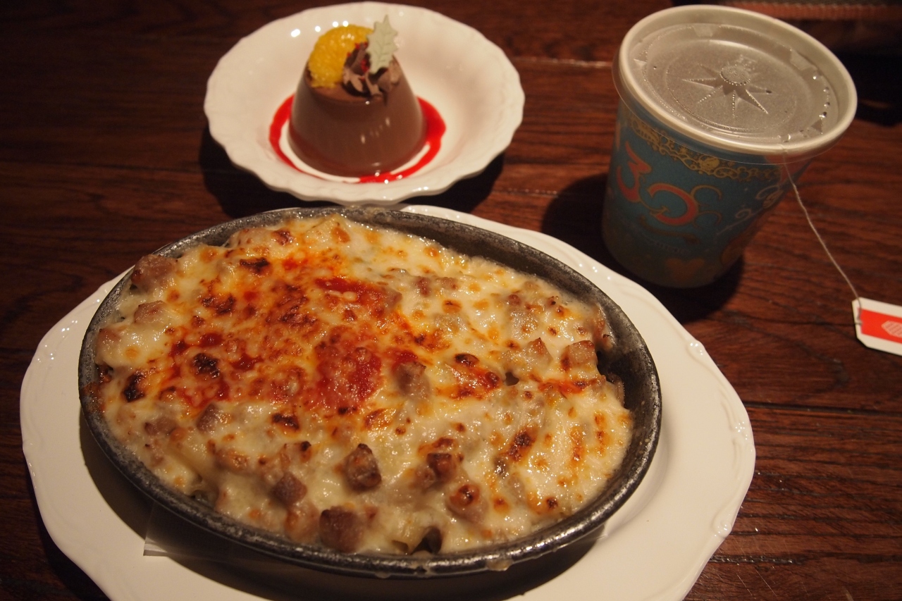 もっちりとしたパン?とターキーを使ったグラタン、チョコレートのムース、ドリンクのセット。プラスでいくらか支払うとドリンクはアルコールに変える事が出来るので母はワインを頂いていました。