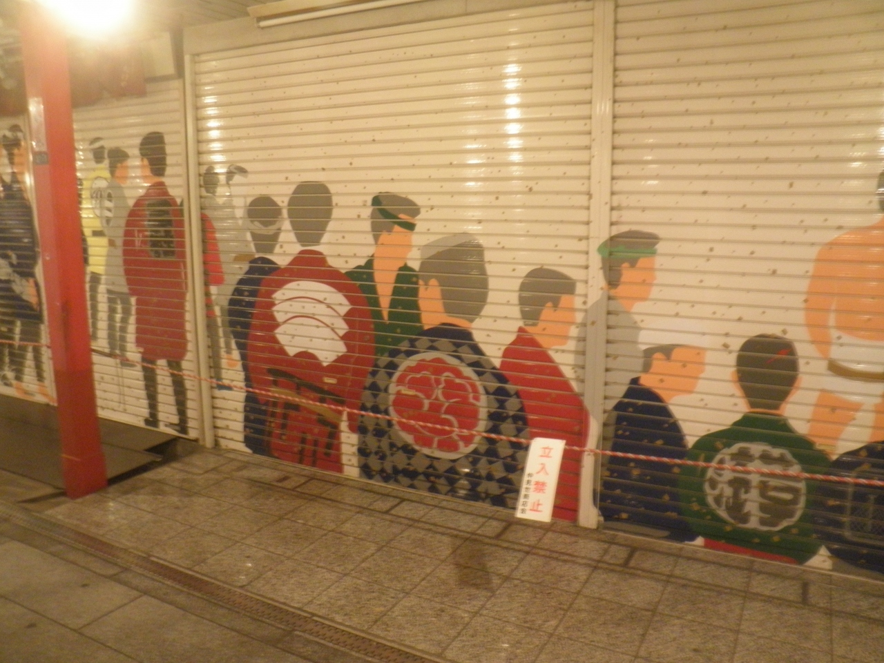 ゴールデンウィークに浅草を観光しました。 もう遅い時間だったのですが、浅草寺にはたくさんの参拝客が訪れていました。 しかし、雷門と本道を結ぶ仲見世通りのお店は大半が営業を終えていました。下ろされたシャッターには江戸のお祭りをイメージした、とても見ごたえのあるものでした。