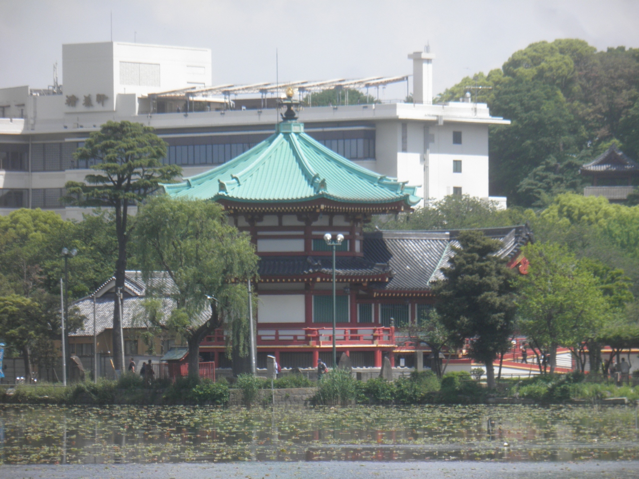 ゴールデンウィークに上野公園を散策しました。 不忍の池に浮かぶ島に赤い八角形のお堂は、湯島からの眺めは、不忍の池が前にあるので池の景観にアクセントをくわえてとても美しいと思います。 まだ、有名なハスはわかい感じで成長するともっとよい眺めになると思いました。