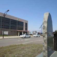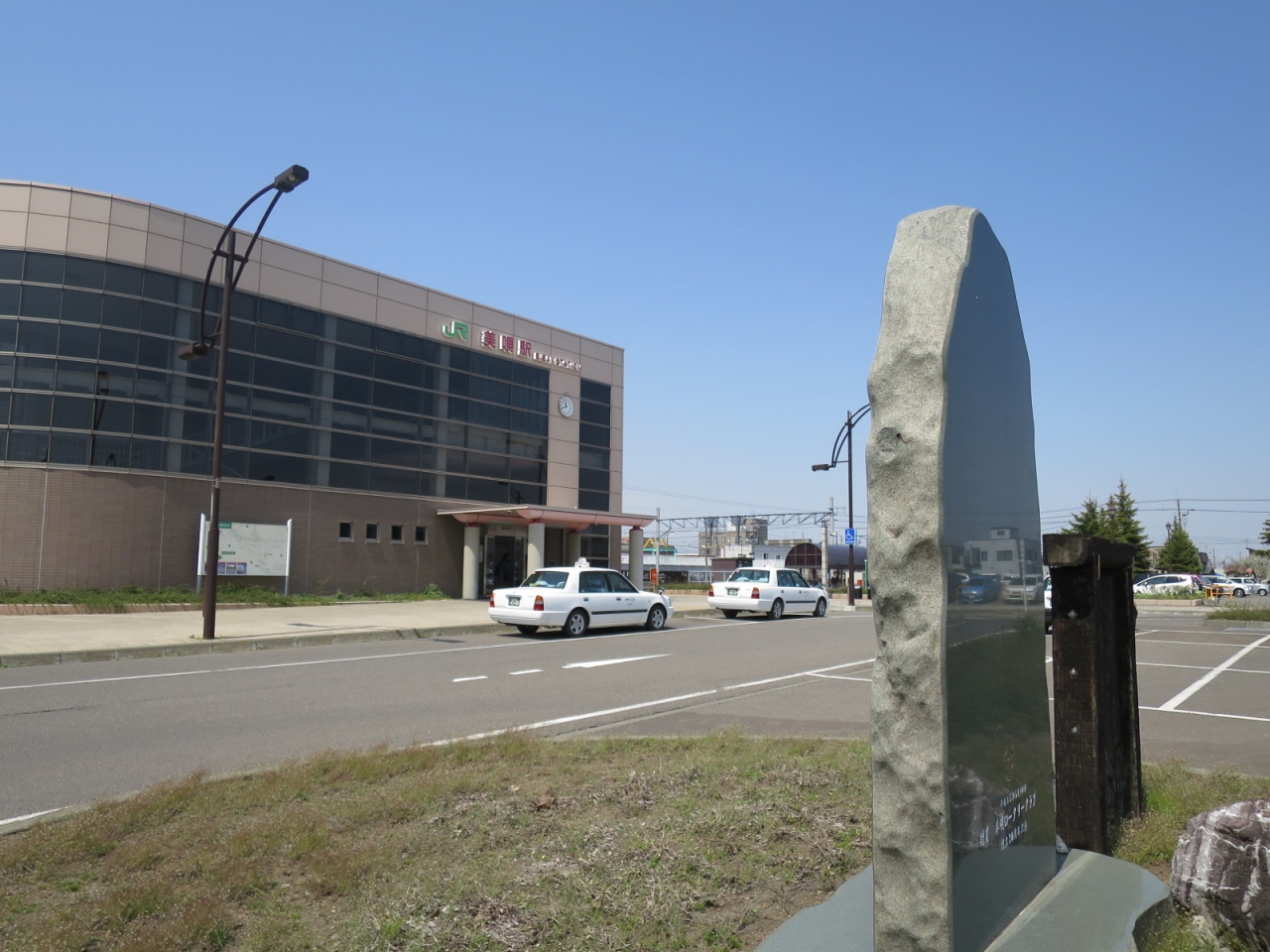 美唄駅の東口ロータリーに立つ歌碑です。東口にもタクシープールがあり、スーパーやドラッグストアもありますが、駅の正面は西口のため、駅を利用してもあまり気づかないかもしれません。場所を知っていたなら、車窓からもなんとか見えるかもしれません。