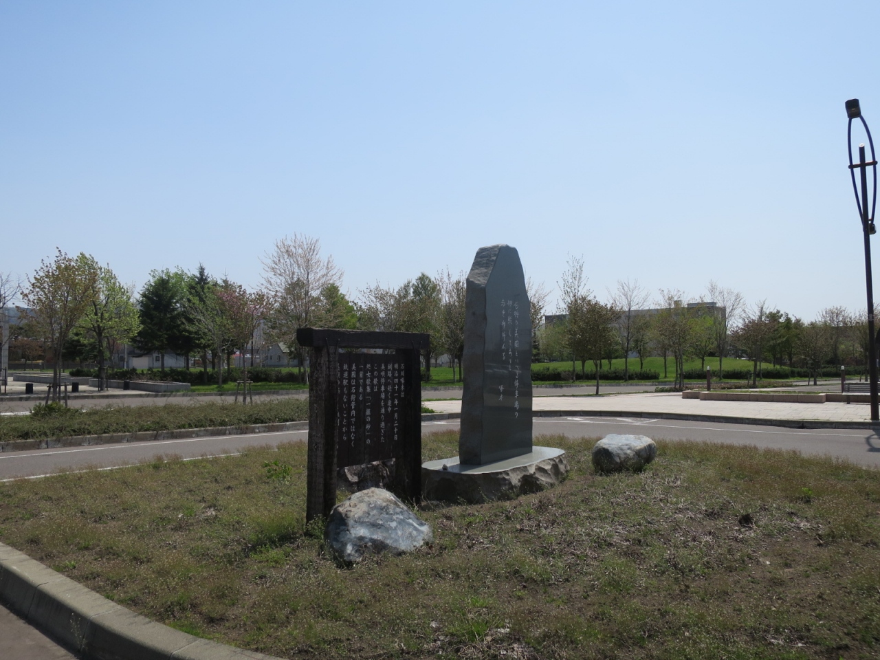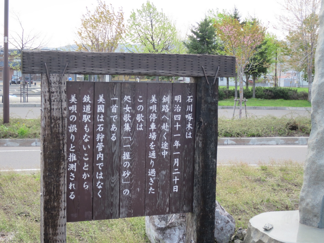 銘文は1908年(明治41年)1月20日に啄木が列車で通り過ぎた際の歌とのことです。美国と謳われていて、駅の名が異なりますが、美唄駅を謳ったものだそうです。2002年に建てられた石碑です。