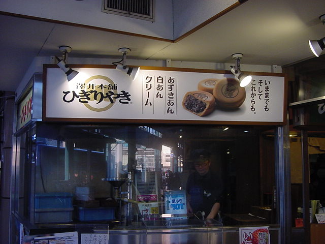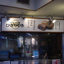 多くの商業施設が集まっている伊予鉄道の松山市駅前に立地する飲食店。店頭では名物のひぎりやきを売っているので、これを食べてみることにしました。大判焼きのような焼き菓子で、あずき、白あん、クリームがあります。1個から買えるので気軽に食べられるのも魅力。