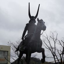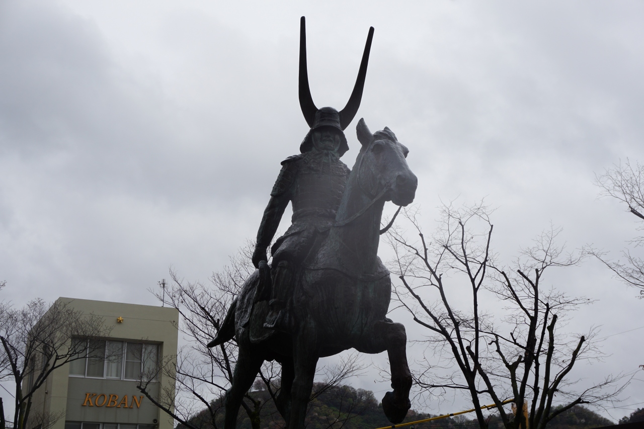井伊直政公像は、彦根駅前のロータリーのところ。馬にまたがった像です。精鋭部隊である井伊の赤備えを率い、井伊の赤鬼と呼ばれた勇猛果敢な大将の姿です。