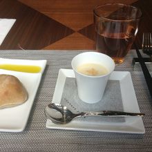 サラダランチを注文。じゃがいものポタージュ、パン、オリーブオイル、鳥肉ののったサラダボウル、アイス珈琲の内容。