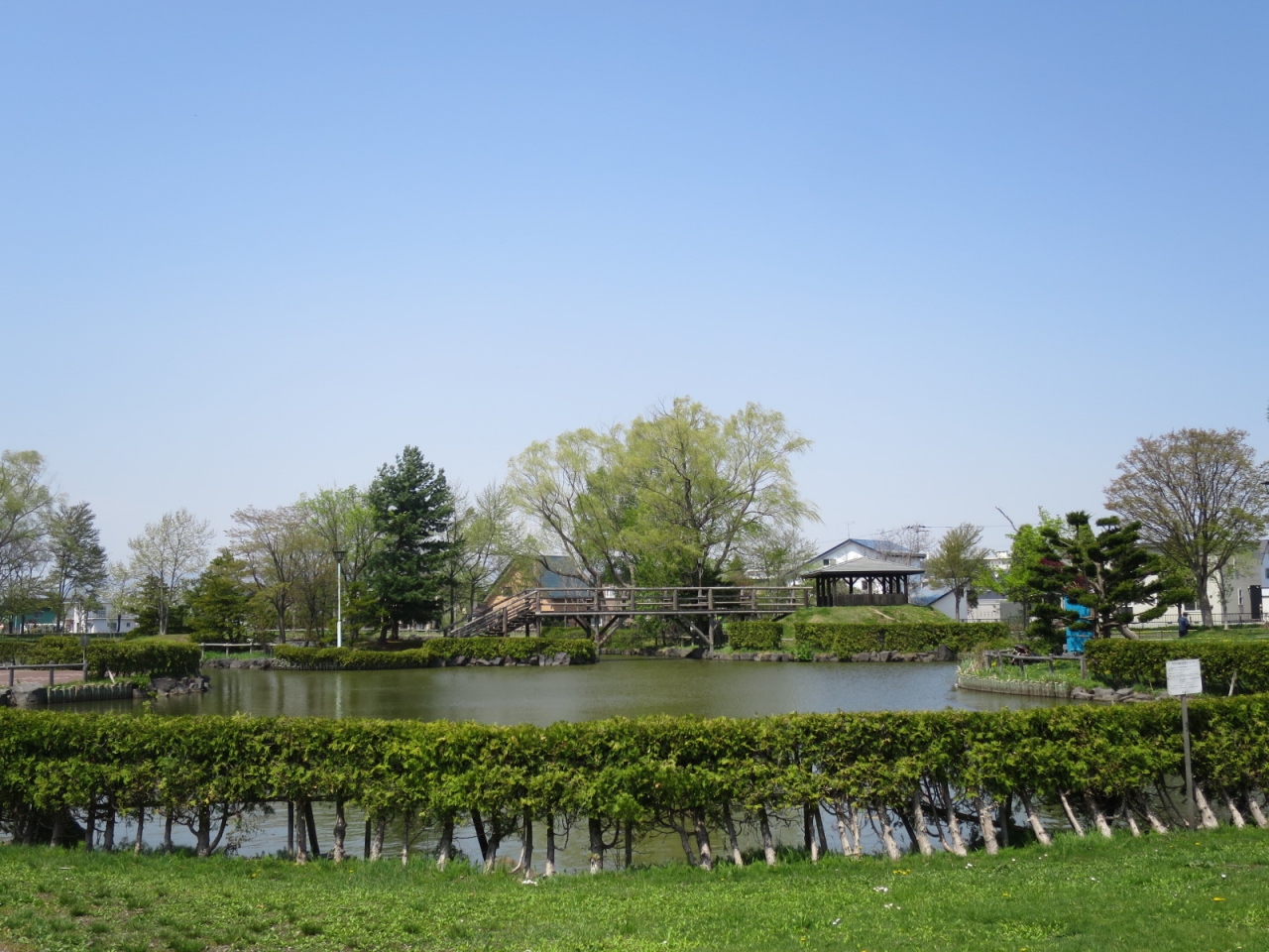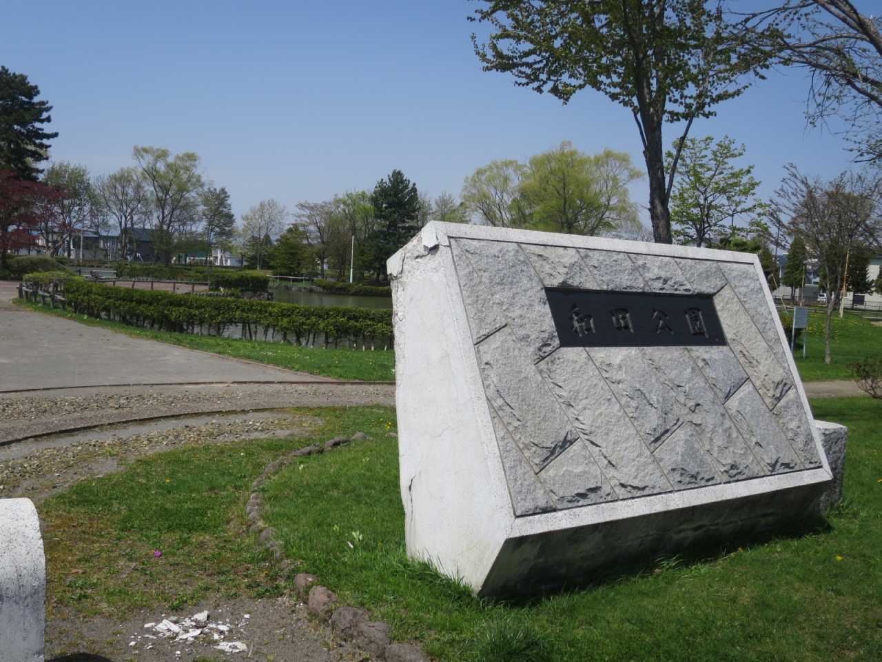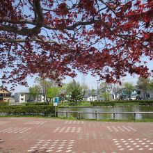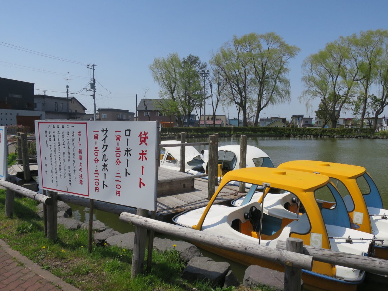 美唄駅の東側、住宅地の中にあって、ボート遊びや子供が自転車の交通が学べる公園です。