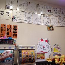 店内に4人位腰かけられるベンチがありましたがみんな歩き食べの様で 空っぽでした。 芸能人のサインや落書き帳がありレトロな雰囲気。