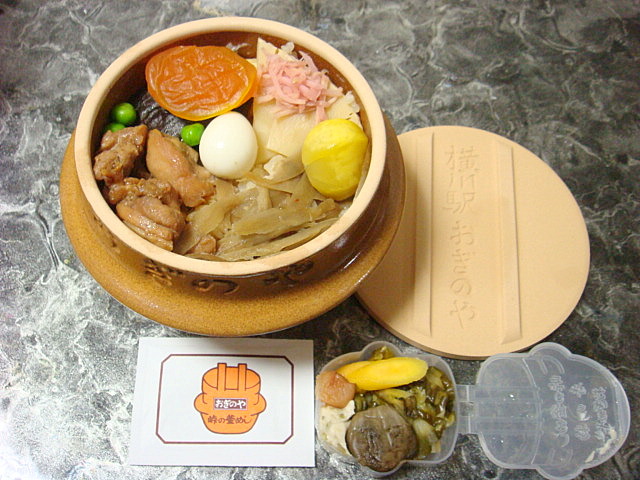 峠の釜めしを食べたくて立ち寄りました。一つは現地で、一つはお土産に購入しました。容器は持ち帰り、今も気分を味わうために使っています。入口には宮内庁御用達の立札と実物が展示されていますが・・・ちょっと中身が違うような・・・彩だけでしょうか?