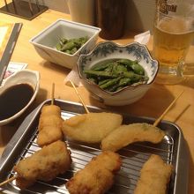 串カツの玉ねぎ、かぼちゃ、ササミ、豚バラ、豚シソ巻きを注文。あと、黒枝豆。串カツはカラッと揚って、自分用タレなので、二度漬けOKです。