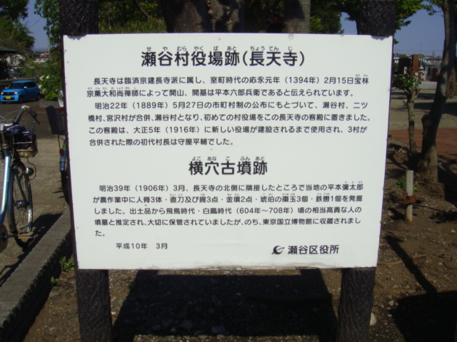 瀬谷八福神のひとつ長天寺は相鉄線瀬谷駅より徒歩10分程度、瀬谷小学校の裏手にあります。元々瀬谷も「七福神」でしたが、最後にこちらの達磨大師を加えて全国でも珍しい「八福神」になったようです。本堂の横には石像の達磨さんがこちらをにらんでいるようでした。また寺の裏には横穴古墳あともありますが、説明書きの看板だけでした。