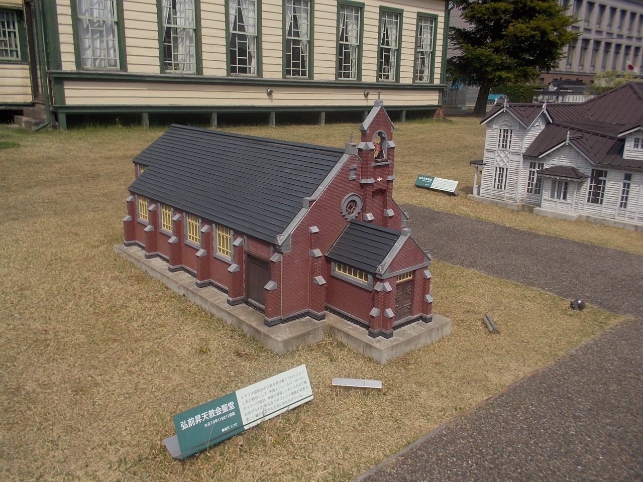 弘前観光館の、ちょうど右斜め後ろにあるので、ちょっと気が付かないですが、かなり小さいサイズの建物があります。 弘前教会、昇天教会、旧図書館や旧青森銀行などを見る事が出来ます。 まるで、自分が巨人になったような勘違いが起こります。
