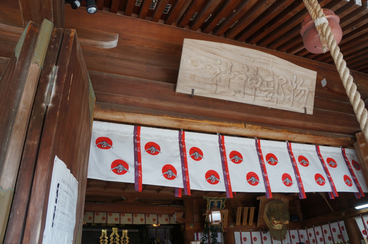御祭神は鶴に乗ってこの地に降臨されたと伝えられている物部氏初代の宇摩志麻遅命でその故事より当社の神紋は赤い太陽を背負った鶴の「日負鶴(ひおいづる)」というカッコいいデザインになっています。