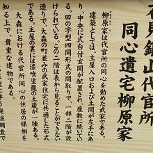 この建物は大森代官所の同心を勤めた武家である柳原氏の武家住宅として使用されていたそうで、案内板によると田の字型四間形式の間取りで、一部に2階部分があるそうです。ただ表からは2階部分が見れないような造りになっているとのことでした。