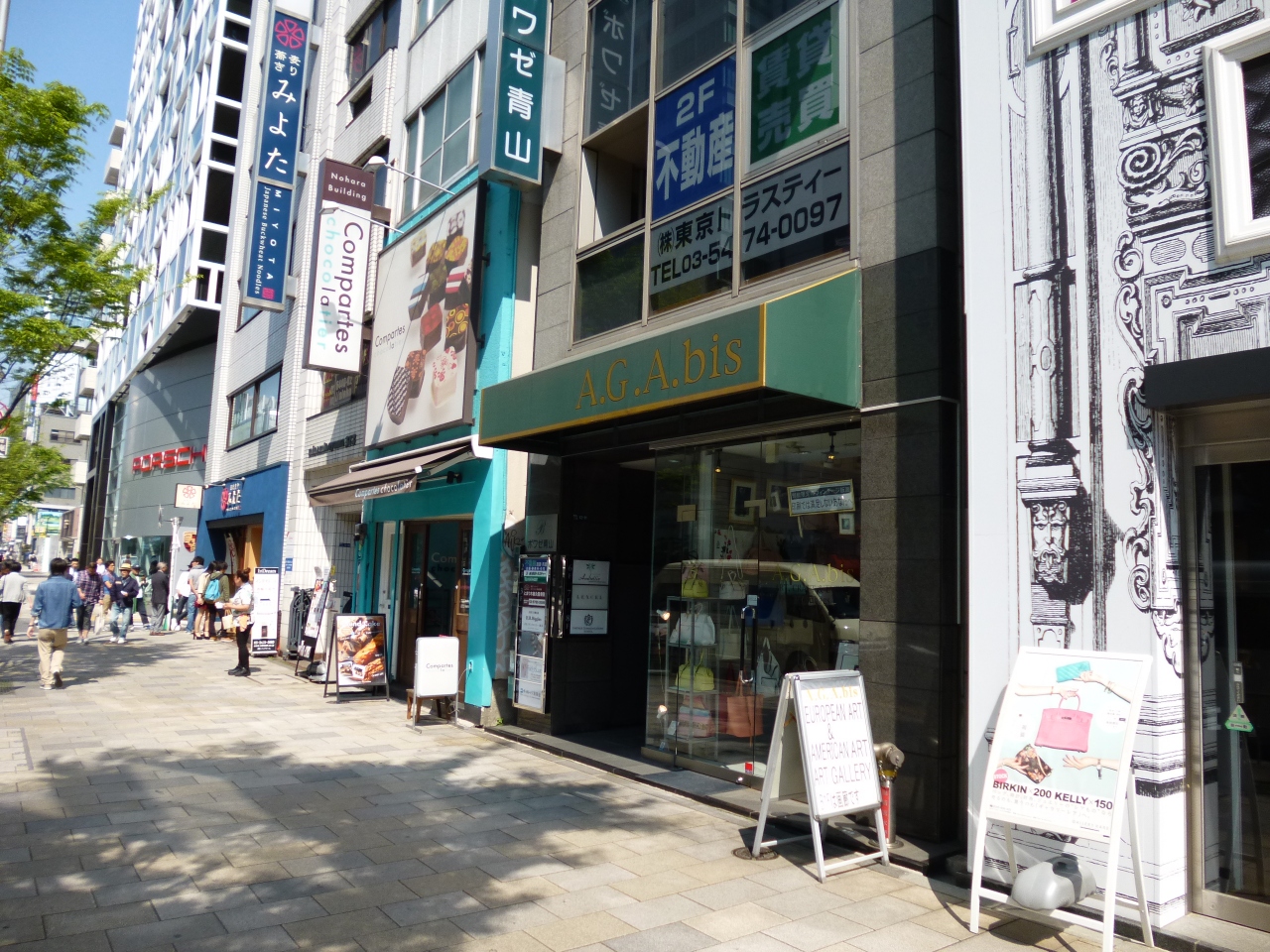 A.G.A.は、Art(アート)Graphics(グラフィックス)Aoyama(青山)の頭文字をとった造語という事です。お店は青山通りに面しており、歩道からはカラフルなバッグが目立ちます。
