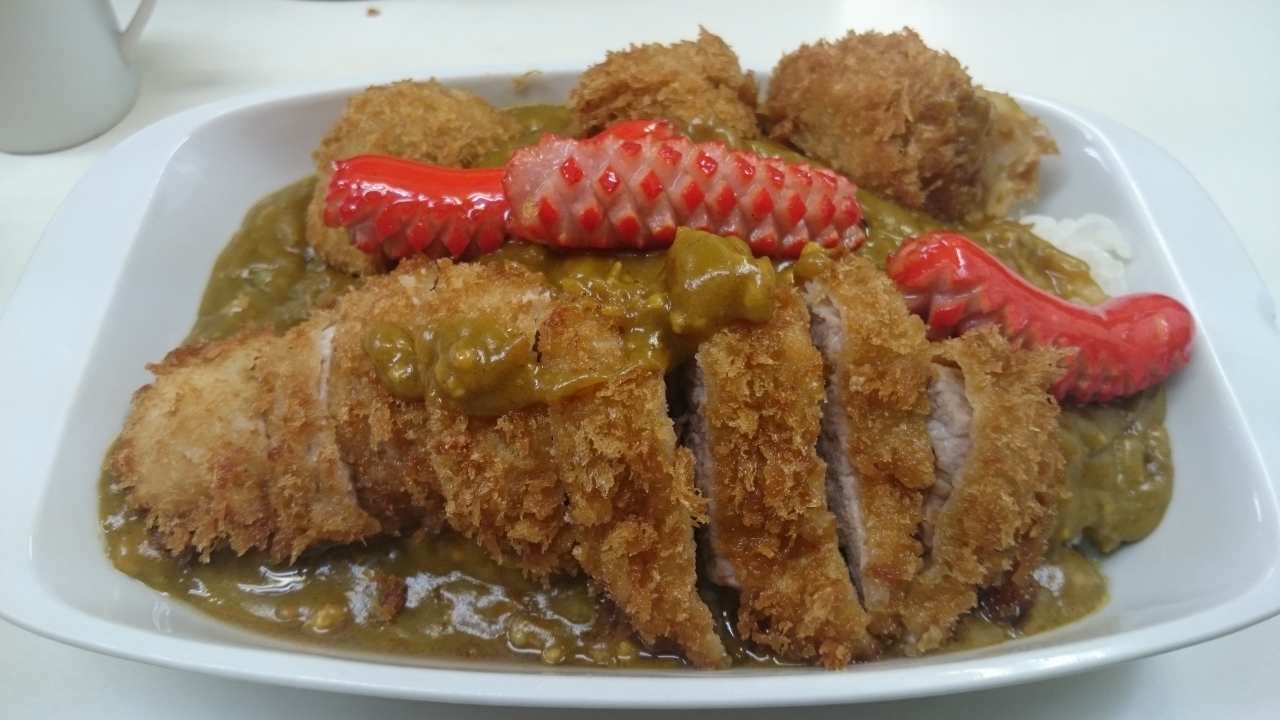 お昼時は結構並びますが並ぶだけの価値あるB級グルメ店。店内はコの字のカウンターのみで、開店はまぁまぁ早いです。自称大食いならぜひ、全部載せをチャレンジしてほしいですが、カツカレーだけでもかなりのボリュームです。カレーの辛さは控えめ、スパイシーさがない分、昔のカレーです。コップの中に刺さったスプーンが昭和レトロ。ルーがこぼれんばかりかけてくれるあたりがにくい。