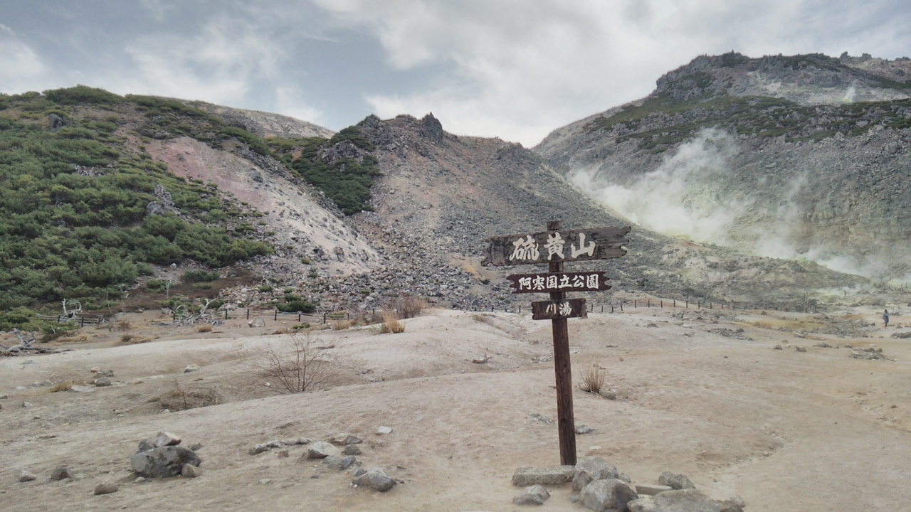川湯温泉の駅から車ですぐのところに硫黄山はあります。想像していたとおり、車からおりた瞬間ににおいが、、、鼻が曲がりますね。