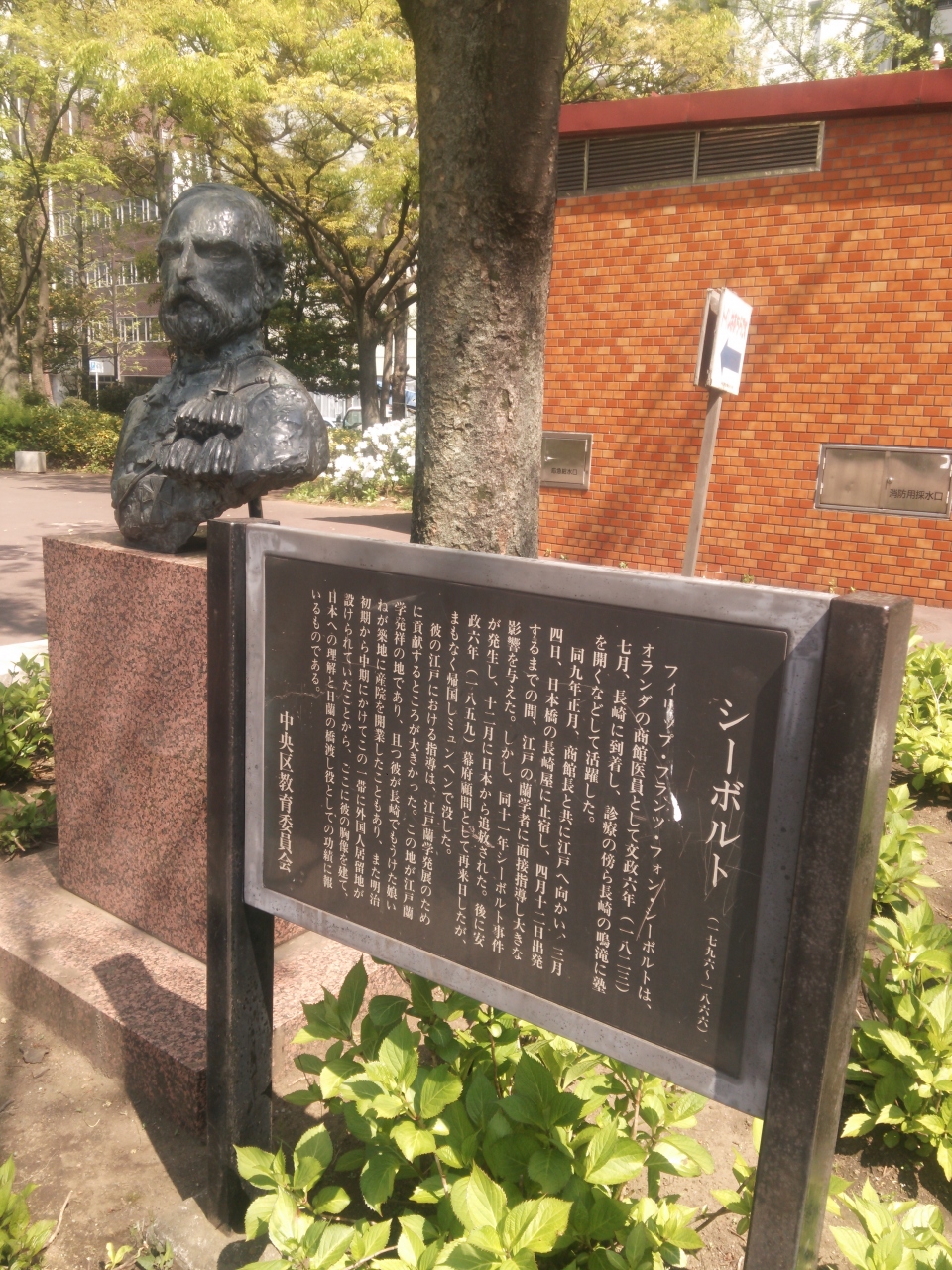 東京の中央区築地7丁目、明石町エリアのあかつき公園内にあります。公園の隅田川側にあります。江戸時代の蘭学発展に大きく貢献したシーボルトを記念して設置されています。あかつき公園にひっそりとある感じが自然でいい感じです