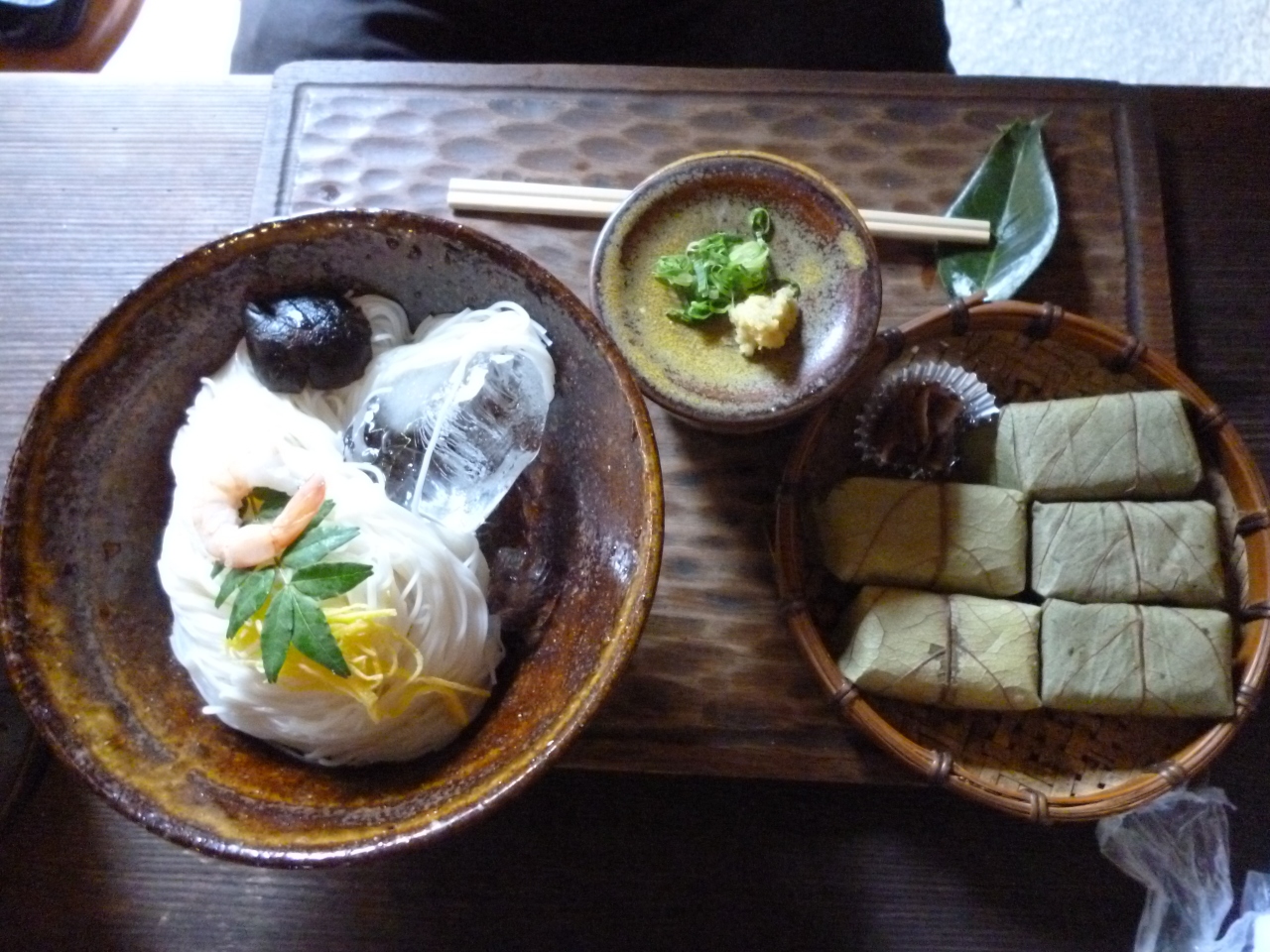 今年も冷やし素麺が食べたくなる季節になりました。氷の上に盛られた、素麺は、ひんやりつるつるで、とてもおいしかったです。名物のカキの葉寿司もいい香りとともにいただきました。11時ごろに行ったのですが、次々とお客さんが来て、すぐ満席でした。予約したほうがいいです。