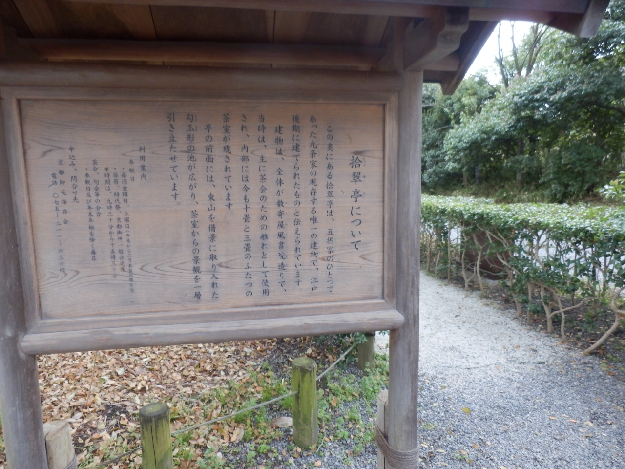 京都御苑の中で京都御所など宮内庁関係建物を除くと見どころのある数少ない建物です拾翠亭と書かれた立札の奥が五摂家の一つであった九条家の現存する唯一の建物です、建物は全体が数寄屋風書院造りで当時主に茶会のための離れとして使用されていたとされ内部歯十畳と三畳の二つの茶室が残されている。毎週金と土曜日に公開されていますが月により異なる場合があるそうですから見学さけるときは、今日都御苑のホームページで確認して下さい、静かなん環境の中で古にふけることができる場所だと思います
