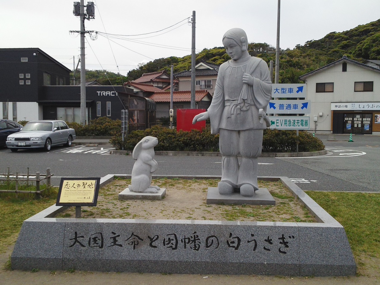 昔おきの島に流されていた白うさぎが気多の崎まで渡ろうとしたサメを騙したことで皮を剥かれて苦しんでいた。そこへ大国主命が通って「身体を真水で洗いガマの穂にくるまりなさい」と助言をくださりうさぎは助かったという神話です。
