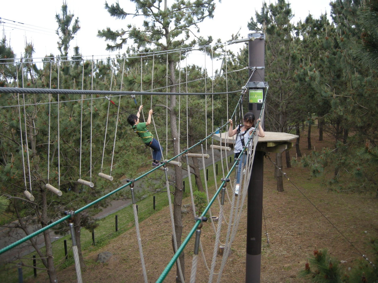 さて、いよいよのサルトビ。一度始めたら終わるまでリタイヤができないというルールのもとドキドキしながら挑戦です。下からみる分には大したことはないのですが上に登ると全然違い、足がすくみます。とても景色を堪能するところまでは気が回らず、とにかくクリアすることだけに必死でした。子供は、とても楽しげになにが怖いの?とばかりに余裕で後ろから私をつつきます。最後のアトラクションでは、転んで背中を打ち付けヒーヒーでした。