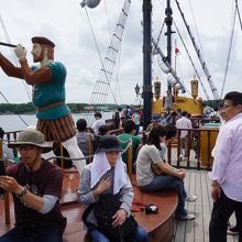 英虞湾を周遊する遊覧船は二つあって、賢島エスパーニャクルーズは大型船。鳥羽湾めぐりの遊覧船とタイプとしては似ています。両方とも内海のような穏やかな海を行くのですが、敢えて比較すれば、こちらは真珠の養殖いかだがあちこちにあって、その間を縫うように走るのが特徴。島の景色はちょっと変化に欠けるかもしれません。