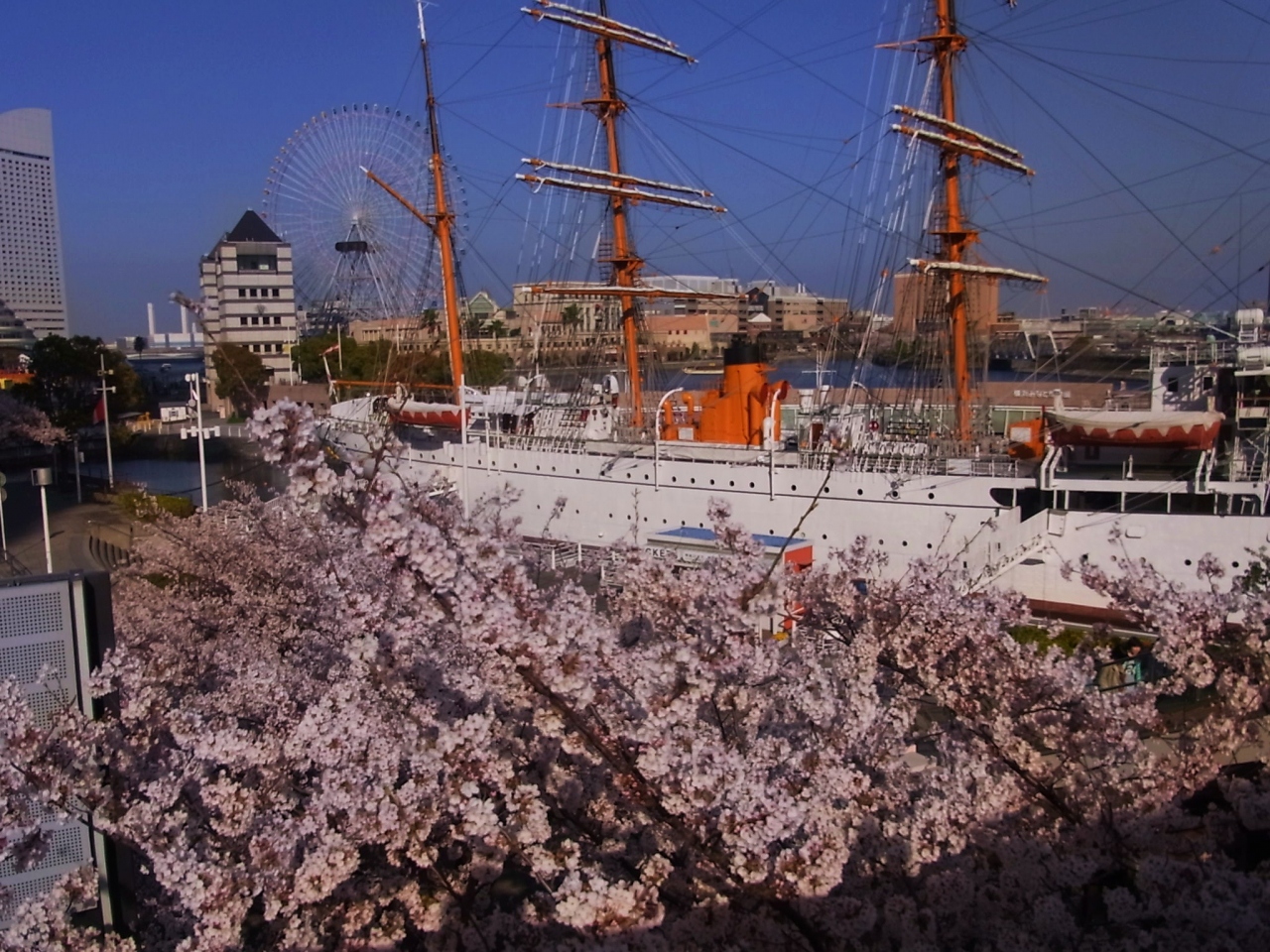 画像は動く歩道から撮りました。まるで桜にういているような日本丸のようです。
