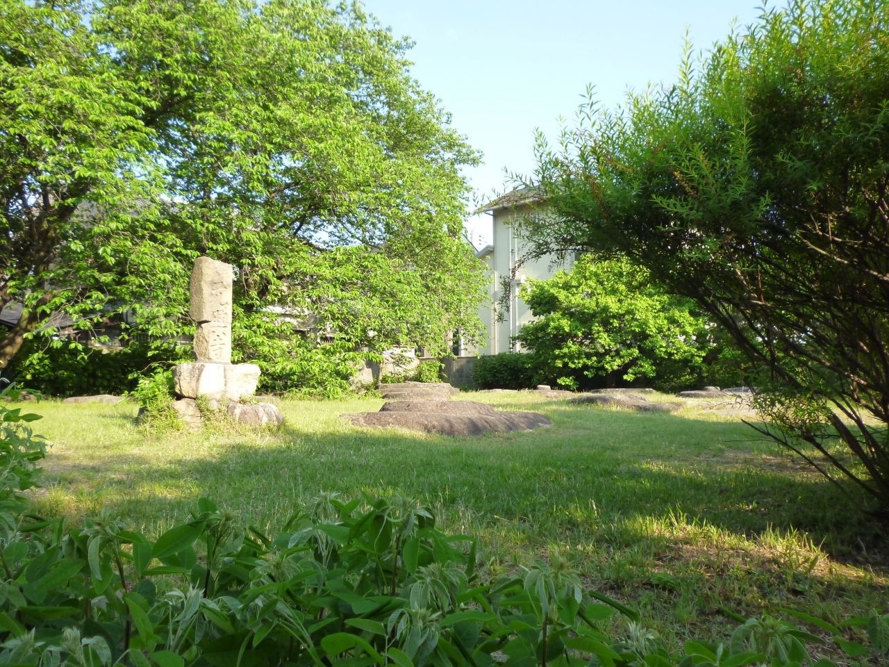 吉田蚊帳さんから、御霊神社に向かって散策していると、左手に「元興寺塔跡」の石碑が立っていました。奥に進み門をくぐると、石垣の上に基壇と楚石が残っていました。興福寺の五重塔をしのぐ高い塔が立っていたことがわかるそうです。自然に囲まれた静かな場所でした。