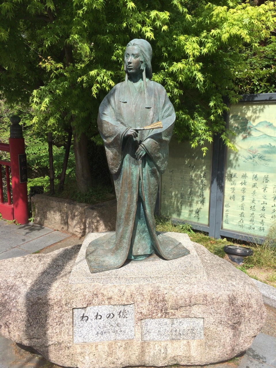 川にかかっている橋の上にねね像があります。交差点をはさんで少し離れたところには太閤秀吉の像もありました。