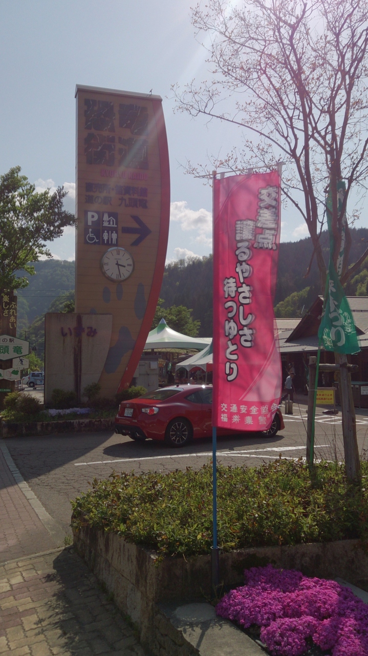 道の駅九頭竜はそれほど大きくない施設でした。この辺りは恐竜の化石が発見されることがあり、ティラノサウルスの化石さえ出ています。道の駅正面には親子のティラノサウルス模型があり時間になると動きます。