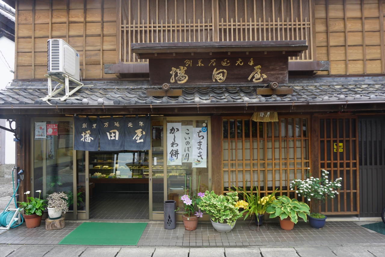 播田屋の本店は、伊勢市駅からは少し離れた河崎地区。播田屋は、150年以上の歴史を持った老舗で伊勢にはいくつかお店があるんですが、本店はこちらです。看板商品の絲印煎餅をいただきました。軽い仕上がりのほのかな甘さなんですが、この甘さはけっこう特徴があって、なんでしょうねえ。他にもいくつかの商品があって試食させてもらいましたが、どれも播田屋風とでもいいたくなるような個性がある。おまじないがかかったようなおいしさのお菓子ばかり。すごいお店だと思います。
