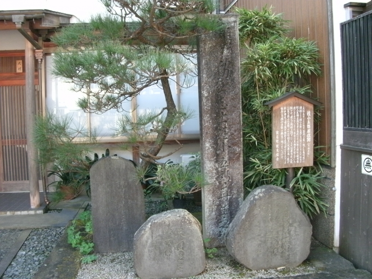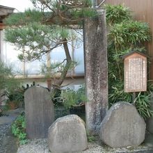 出石城跡の前の駐車場から北に歩いて5分ほど、出石そばで有名な“よしむら”の隣りに石碑と説明板があります。