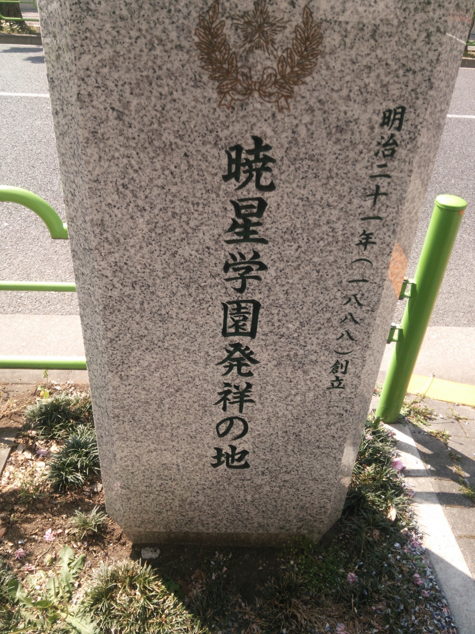 明石町、明治、昭和初期の日本の近代史の発展のエリアにあります。立派な記念碑です。日本発のカトリック教会だったという築地教会の門の前にあります。暁星学園は、明治21年に創立されて、幼稚園、小・中・高までの教育をするをカソリックの学校法人です。