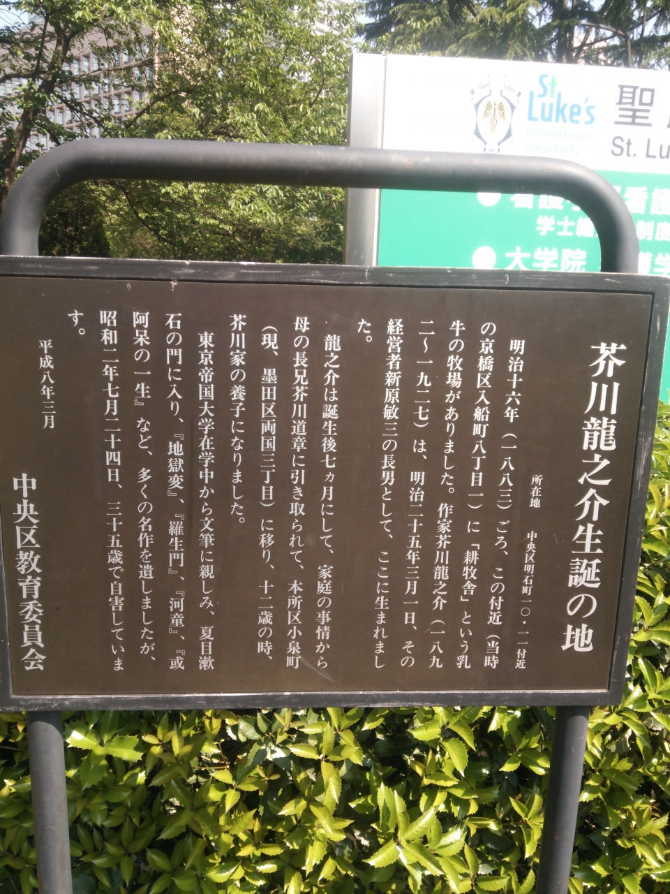 赤穂藩主浅野内匠頭の屋敷跡の記念プレートのとなりあります。不思議な感じです。また日本の近代文学の文豪の代表的存在ですが、芥川龍之介は、この地で牧場の家の子供として生誕しそうですが、成長は別の場所です。両国もその一つです。