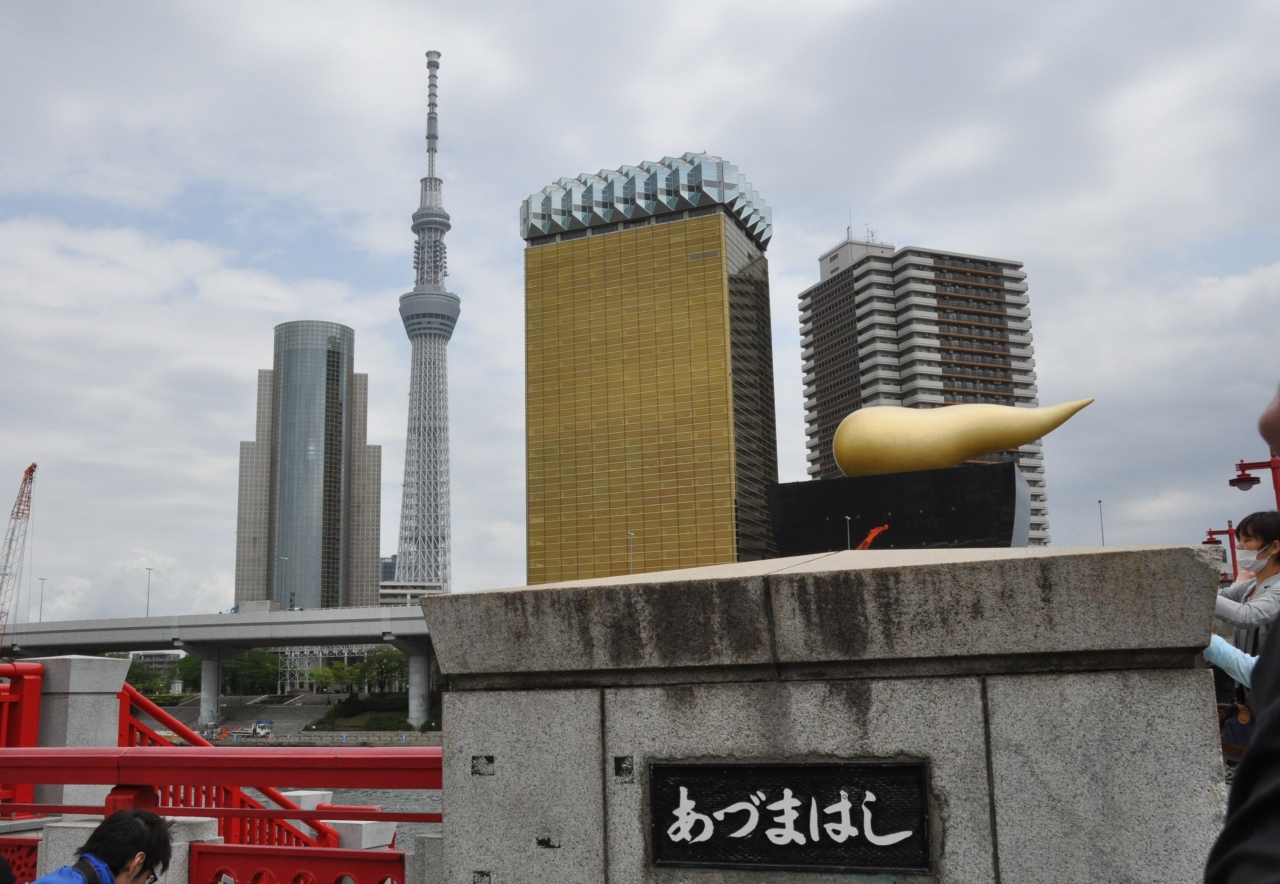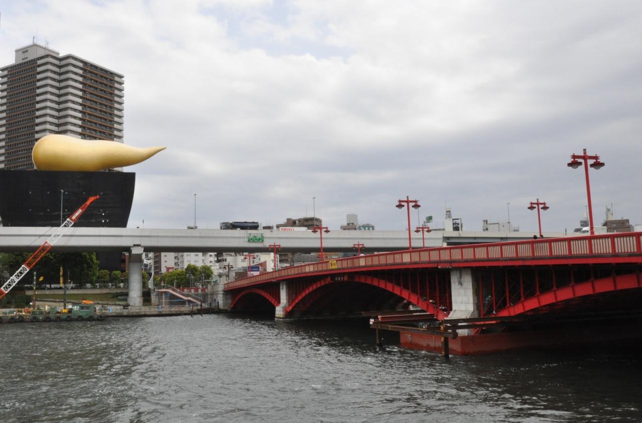 浅草寺参拝後、スカイツリーに昇り、その後に隅田川クルーズに向かった。スカイツリーから降りて、隅田川水上バスに向かう途中に、吾妻橋のたもとから見るスカイツリーは良い眺めで、絶景のビューポイントといえるだろう。そして水上バスからは地上からとはまた違う角度から吾妻橋を見ることができ、併せてアサヒビールのモニュメントも見え、よい景観となっている。
