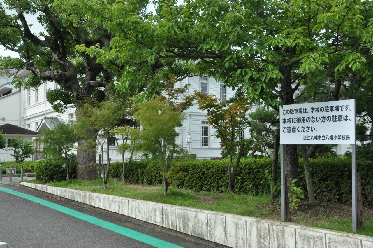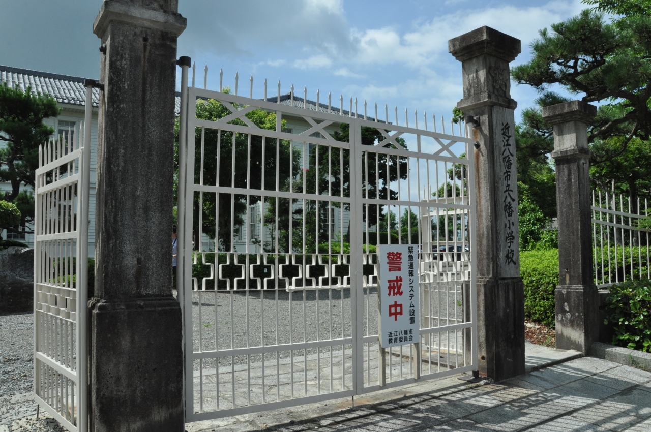 JR近江八幡駅前からバスに乗り小幡上筋で降りて、八幡堀に向かっている歩いている途中に白亜の立派な建築物があった。近寄ってみるとそれは近江八幡市立八幡小学校校舎であり、現役の公立小学校だったことに驚いた。縦長の窓が配された木造の洋風建築で、一見歴史的建造物のようにみえるが、外観はとても綺麗であまり古さを感じなかった。後で調べると、大正時代に田中松三郎氏の設計で建てられた校舎を最近オリジナルの意匠を残しながら改築したようだ。このような素晴らしい校舎の内部はどうなっているか見たかったが、もちろん無理。写真を撮って終了。