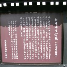 現地にあった説明板によると、おりゅう灯籠の名前は鎌倉時代の悲恋物語の主人公にちなんで名付けられたもので、灯籠と柳の木をおりゅうと恋人が寄り添って立つ様子に見立ているとか。