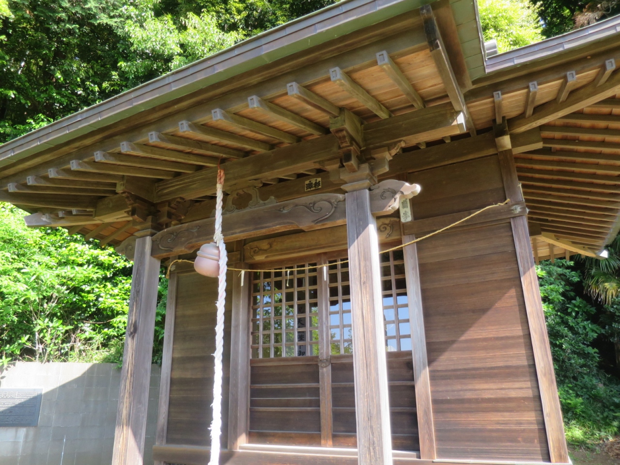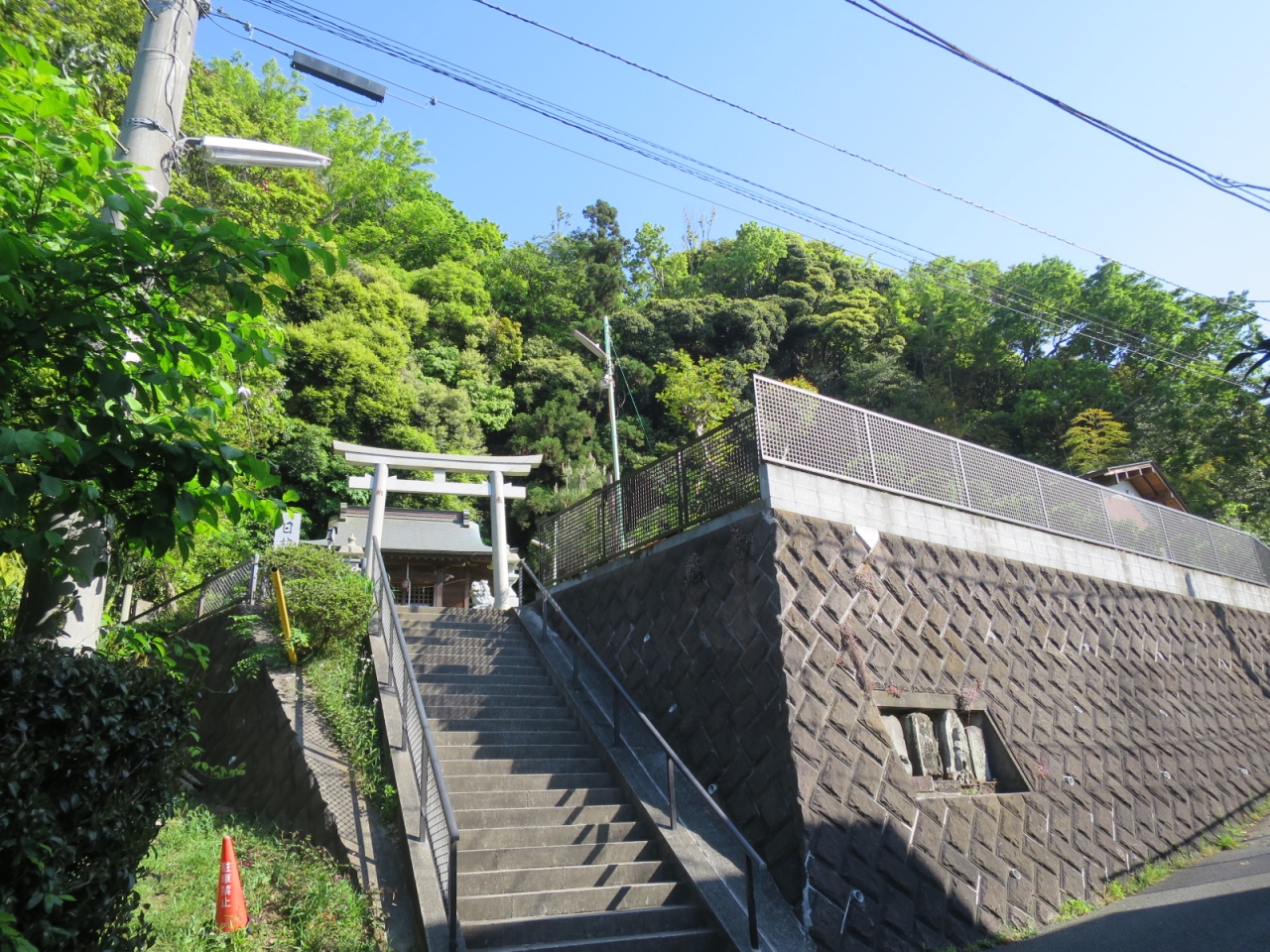 トンネルの上だけに、傾斜地となっていて、祠まで階段を上ります。しかし、残念ながら眺めは目の前を通る新湘南バイパスの高架で遮られています。