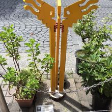 麻布十番商店街のモニュメントのうちのひとつです。ベネズエラ大使館の協力により作られています。他のモニュメントと明らかに違うのが、真っ黄色であることと、鉢植えの植栽やポールとチェーンにより、ガードされていることです。多分、近所の方の好意でやっていることと思います。